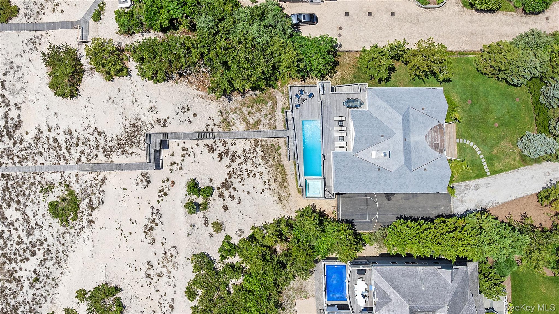 - Aerial perspective of suburban area featuring a pool and a nearby body of water