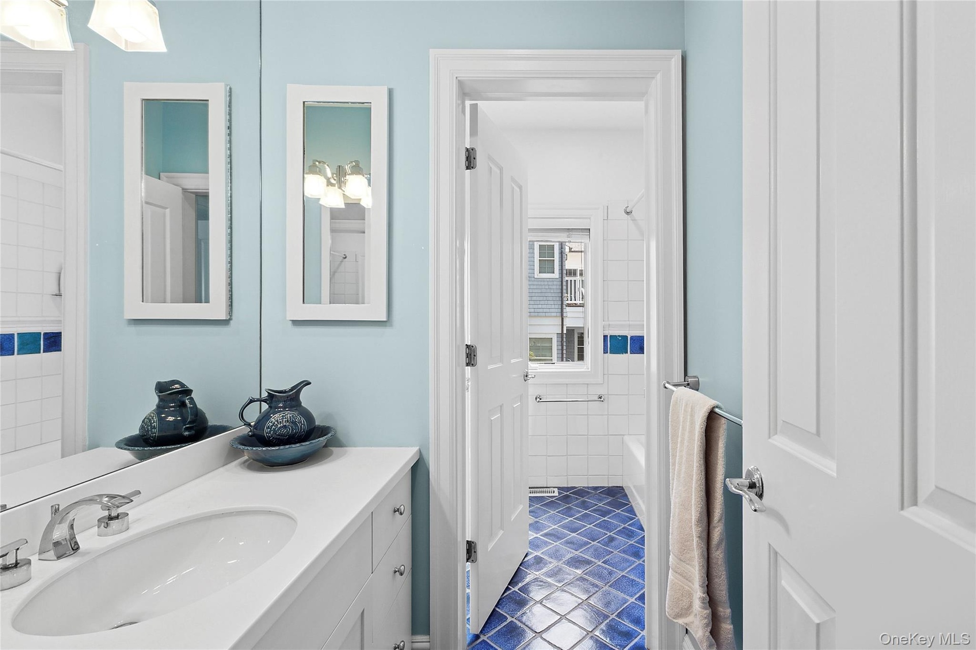 - Bathroom with tile walls, tile patterned floors, double vanity, and a whirlpool tub