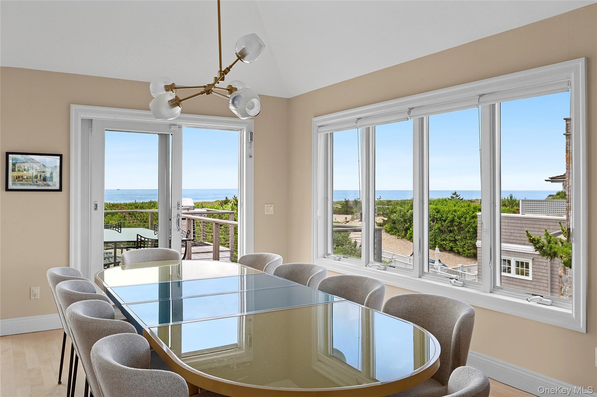 - Dining area with a chandelier, a water view, and light wood-style flooring