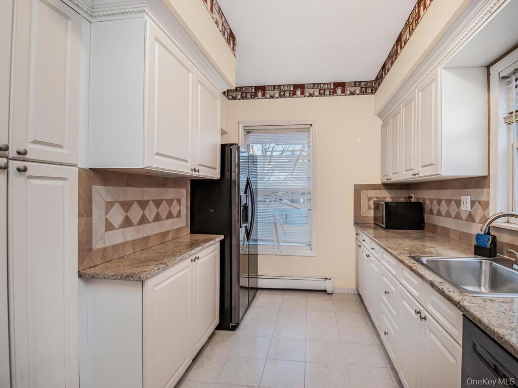 - Kitchen featuring white cabinets, black refrigerator with ice dispenser, dishwashing machine, and stainless steel microwave
