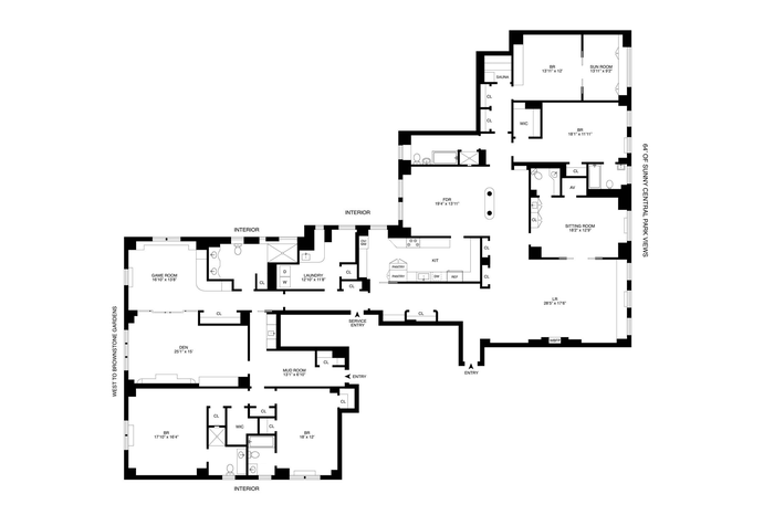The combination of two large apartments offers endless possibilities. In what was the "classic six" are game and TV rooms and a wall of custom built-ins. This millwork covers a wood-burning fireplace that could be exposed and enjoyed again. These rooms could be reworked as bedrooms in addition to the two other very spacious ones in this wing, which each have their own en-suite bathrooms.