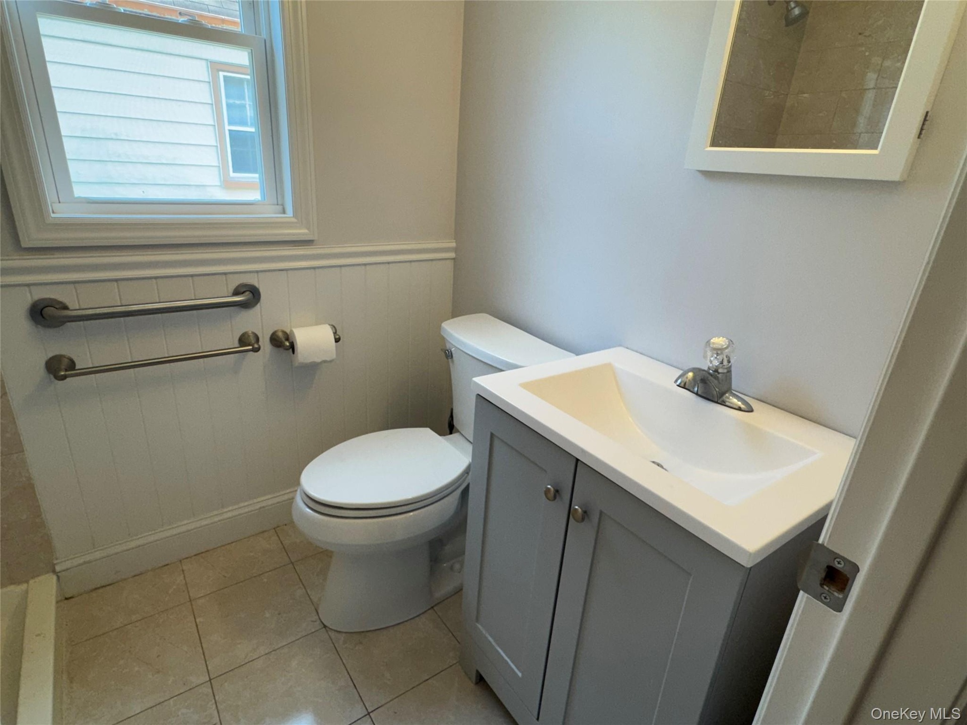 - Bathroom featuring vanity, a wainscoted wall, tile patterned flooring, and a shower