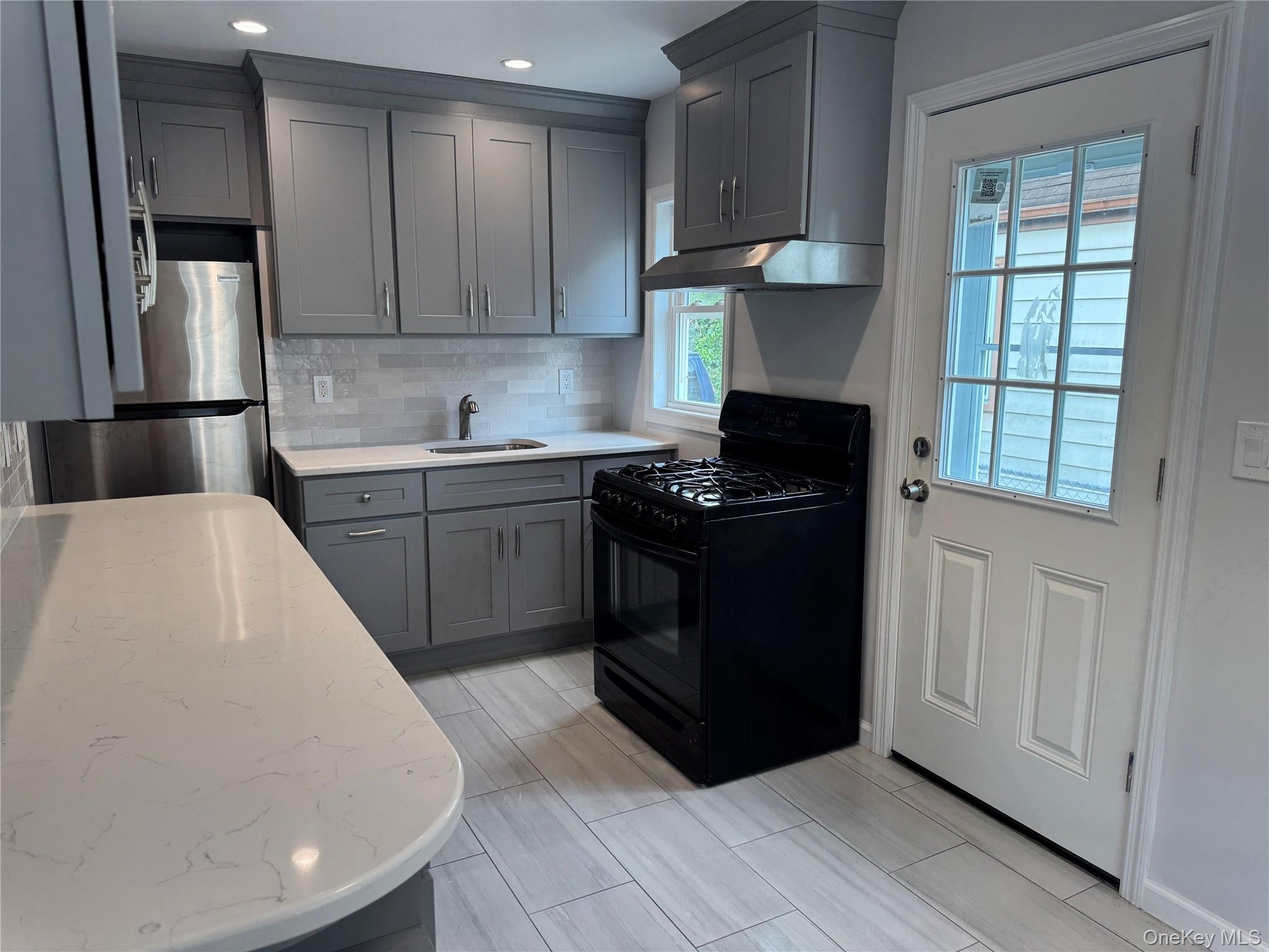 - Kitchen featuring gray cabinetry, black range with gas stovetop, freestanding refrigerator, decorative backsplash, and range hood