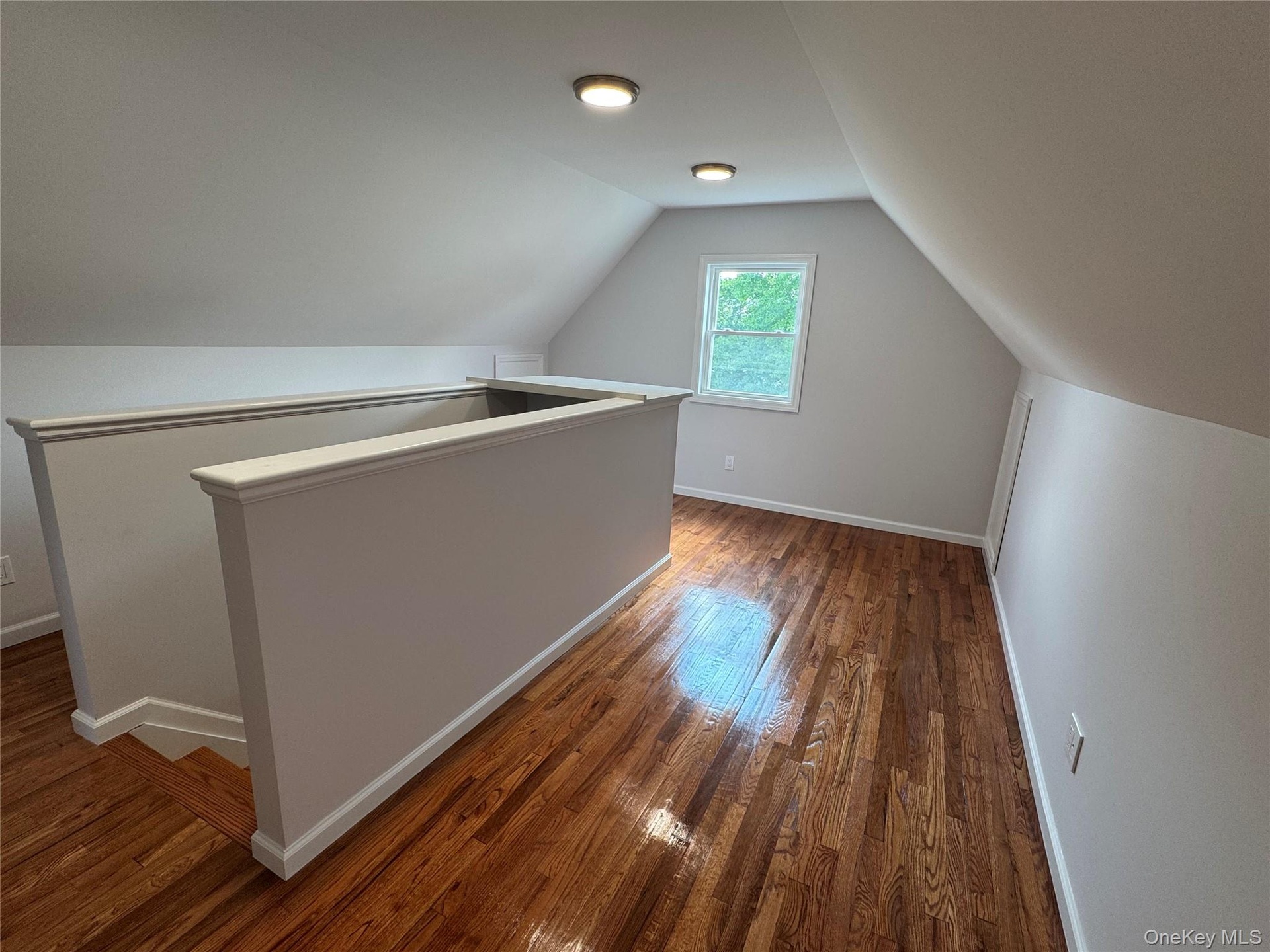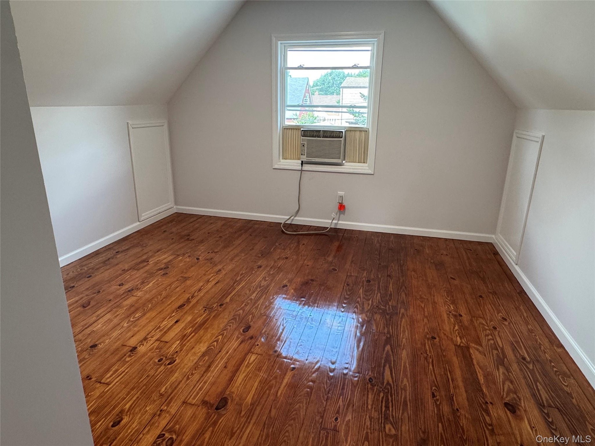 - Additional living space featuring wood-type flooring, lofted ceiling, and cooling unit
