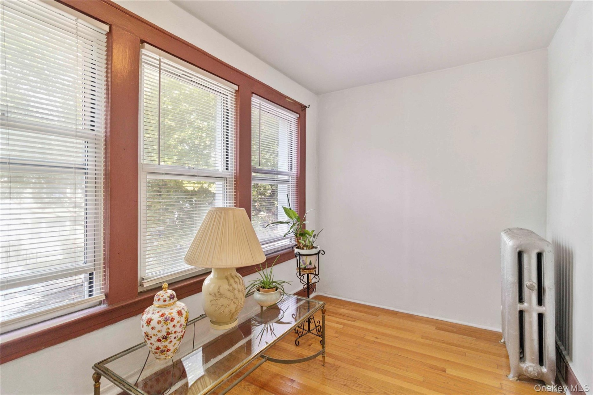 - Sitting room featuring radiator heating unit and light wood-style flooring