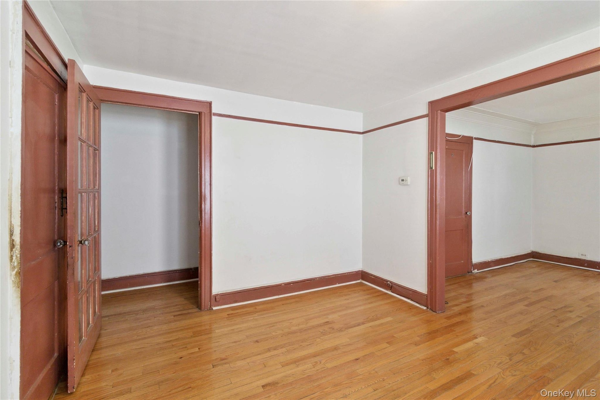 - Unfurnished room with light wood-style flooring and ornamental molding