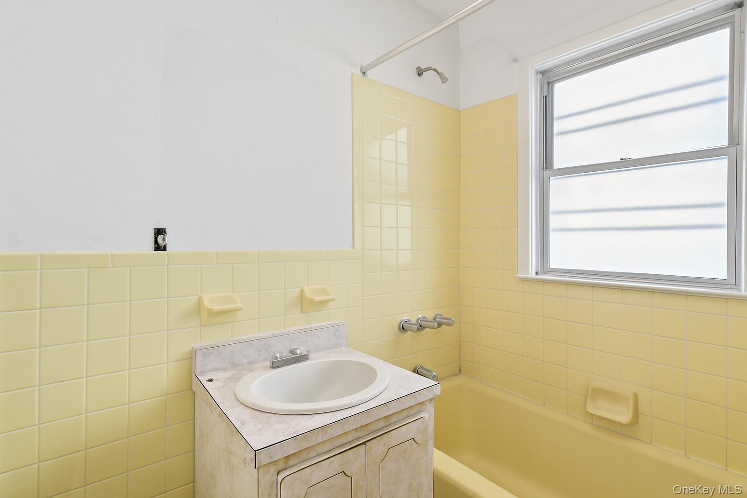 - Bathroom with tile walls, bathing tub / shower combination, and vanity