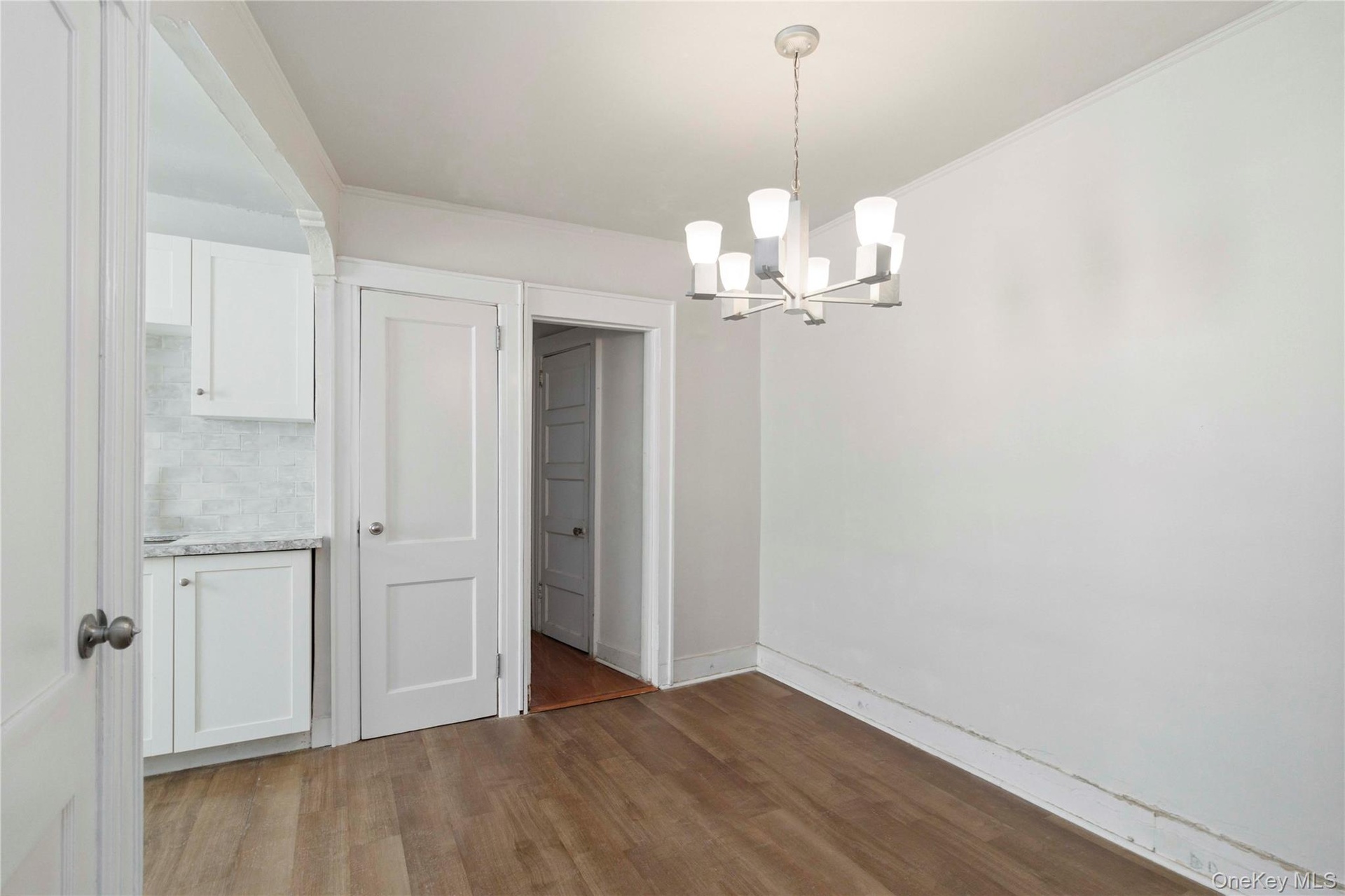 - Unfurnished dining area featuring a chandelier, wood finished floors, and ornamental molding