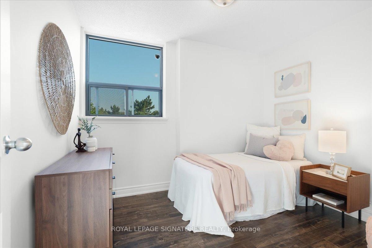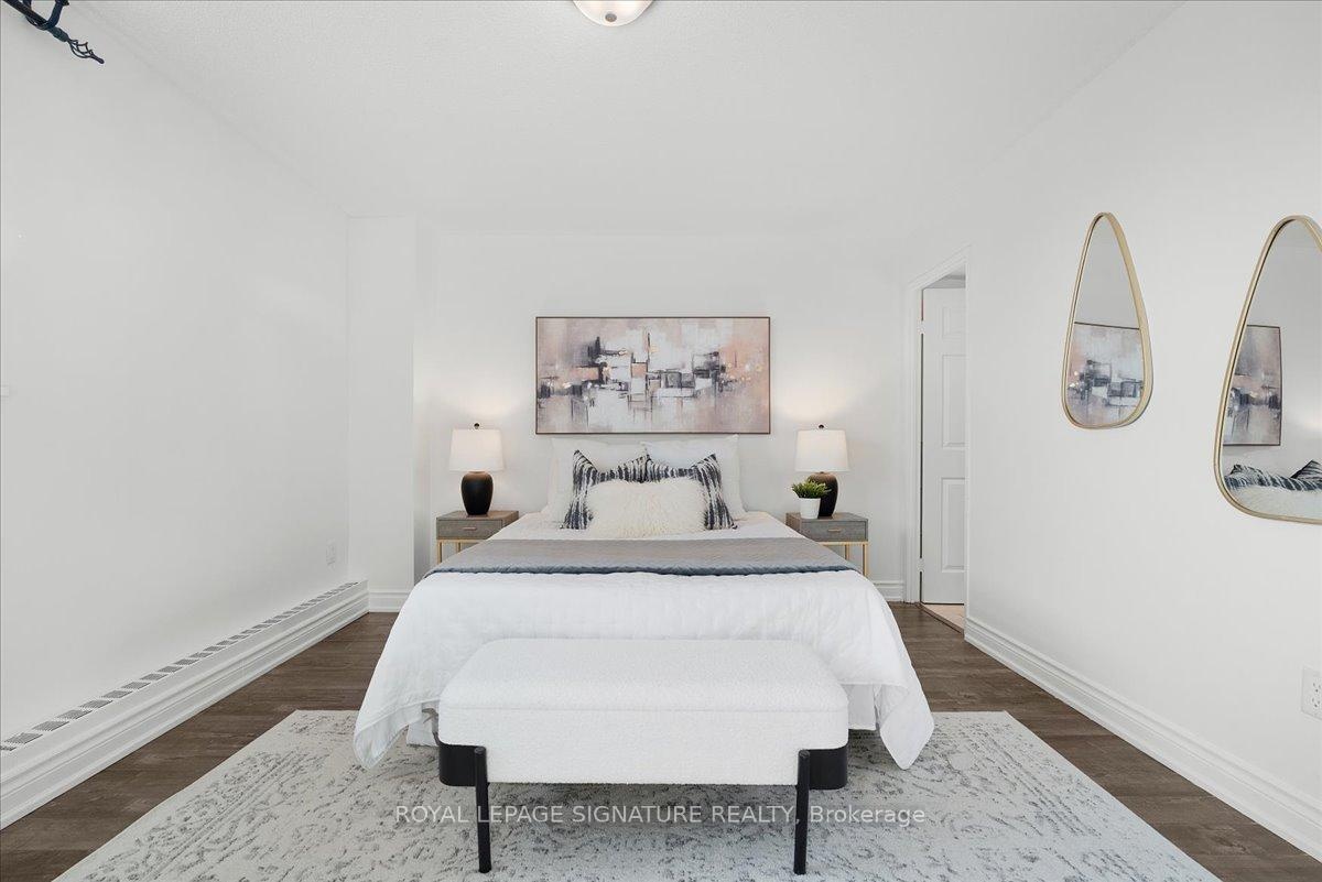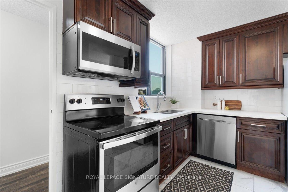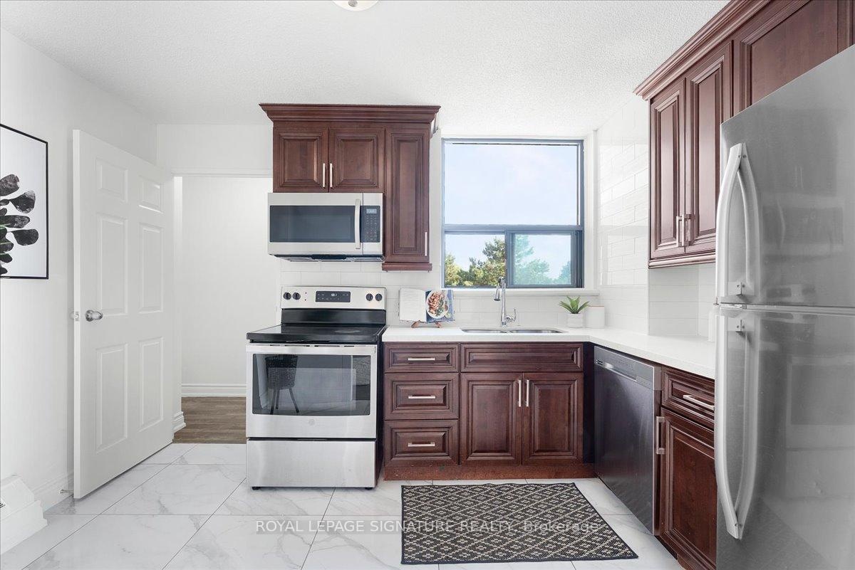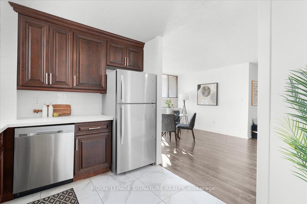 DescriptionWelcome to your new home, Suite 315 at 100 Wingarden. A beautifully renovated move in ready, freshly painted 2 bedroom, 2 bath corner suite offering the perfect blend of style, comfort and unbeatable convenience. Located on a desirable lower floor for easy access without elevator waits, this bright and spacious condo features open-concept living and dining area that's perfect for entertaining, a large updated kitchen with full-size appliances, sleek countertops, rich cabinetry and a rare oversized walk-in pantry. This smart split-bedroom layout ensures privacy, with the primary bedroom featuring a walk-in closet and a private ensuite bathroom. A rare condo convenience of a full-sized separate laundry room adds everyday easy. Finally step outside onto your private balcony to unwind with peaceful views and abundant natural light. All-Inclusive Maintenance Fees: Heat, hydro & water and dedicated underground parking Prime Location: TTC transit, schools, shopping, places of worship, parks and HWY 401/407 Desirable End Unit: Quiet, private and filled with natural light. Upcoming Upgrades: New balcony doors/windows this summer + a new gym facility, management to announce soon. This is more than a condo, it's a smart investment in a value-adding building through meaningful upgrades and proactive maintenance. Don't miss out on this spacious, stylish, and serene home!Amenities- Elevator