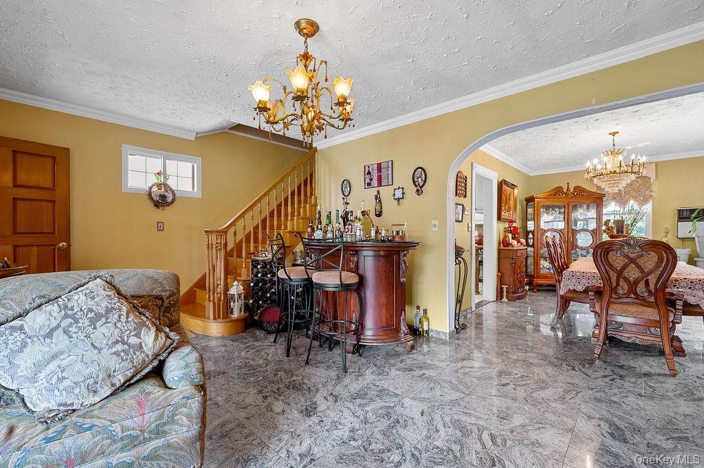 - Living area with a chandelier, ornamental molding, and a textured ceiling