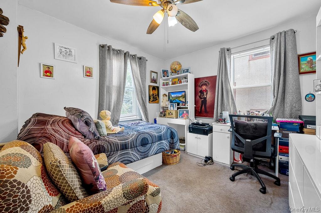 - Carpeted bedroom featuring multiple windows, a desk, and ceiling fan