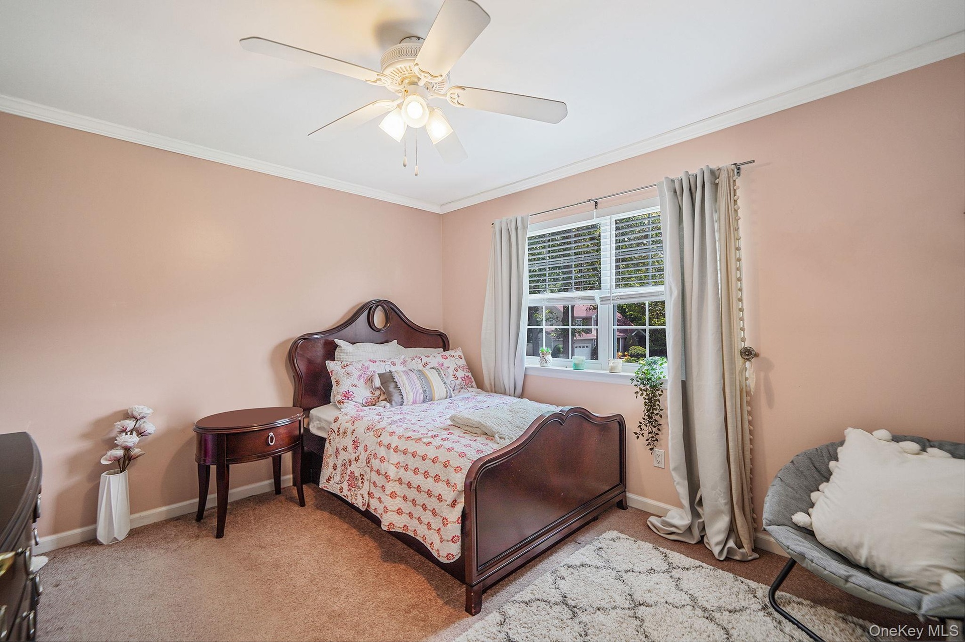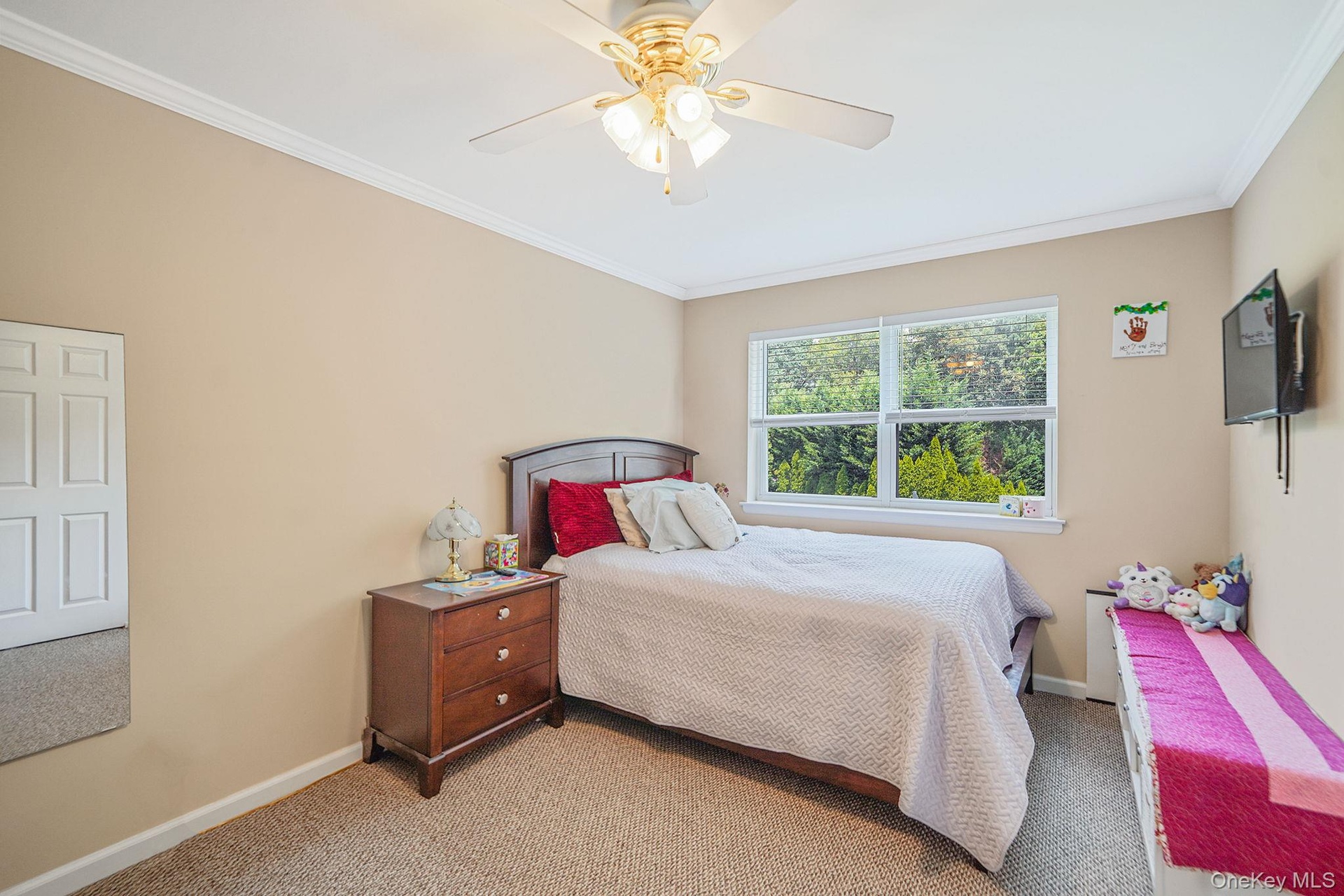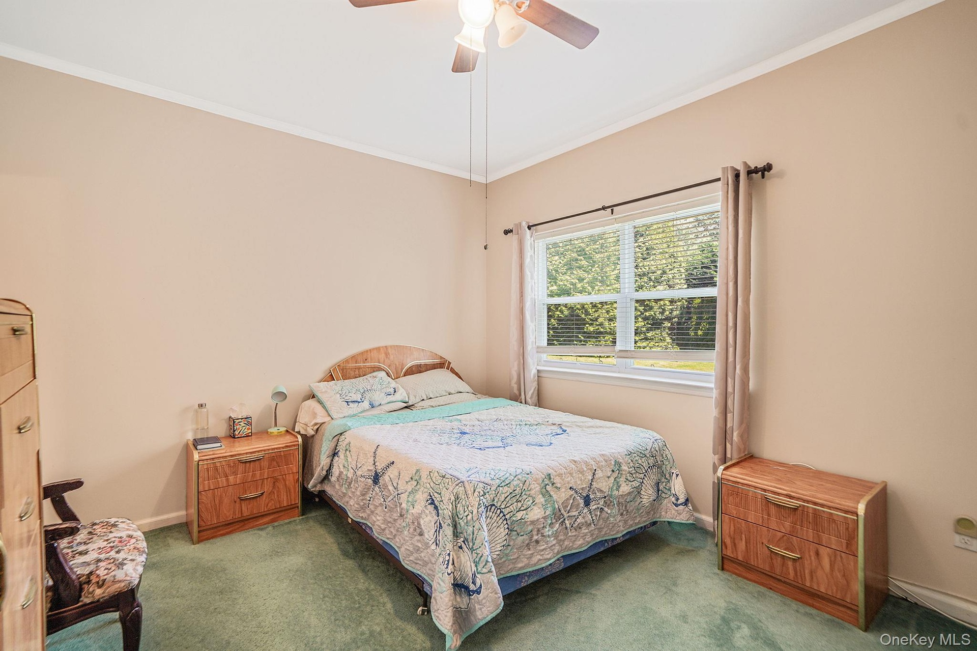 - Bedroom featuring crown molding, carpet floors, and a ceiling fan