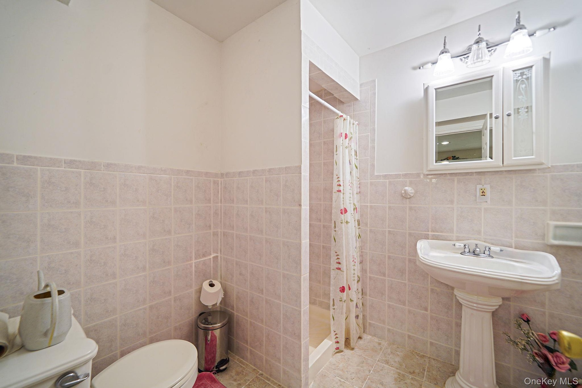 - Full bath featuring tile walls, a stall shower, a wainscoted wall, and tile patterned flooring