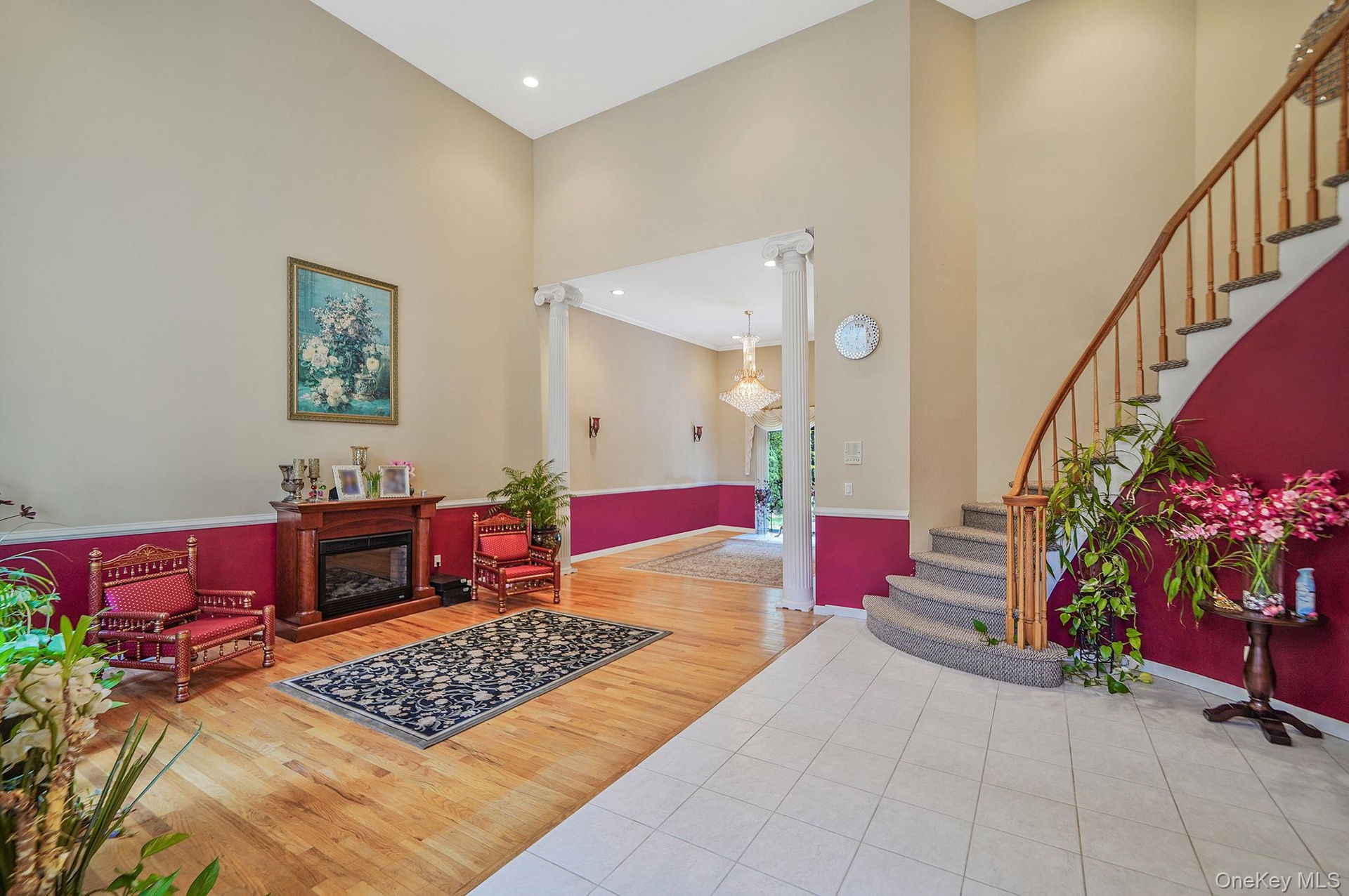 - Tiled foyer with a towering ceiling, stairs, a glass covered fireplace, and recessed lighting