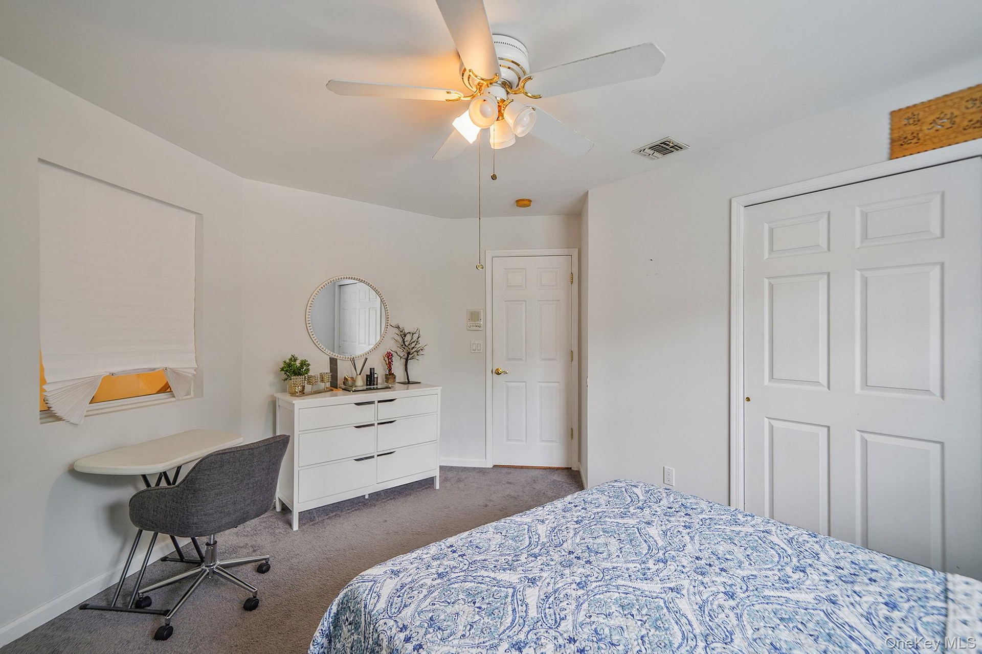 - Bedroom with carpet floors, a closet, and a ceiling fan