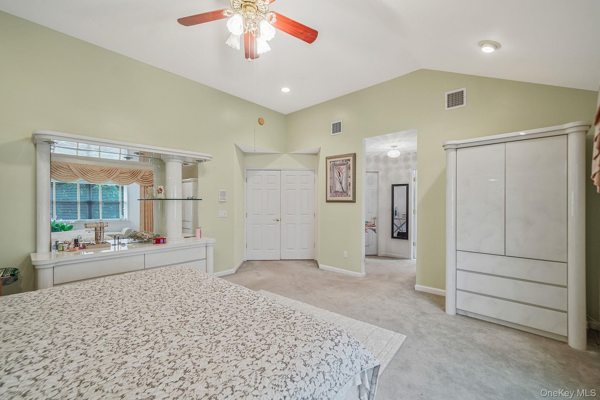 - Bedroom featuring light carpet, recessed lighting, lofted ceiling, and a ceiling fan