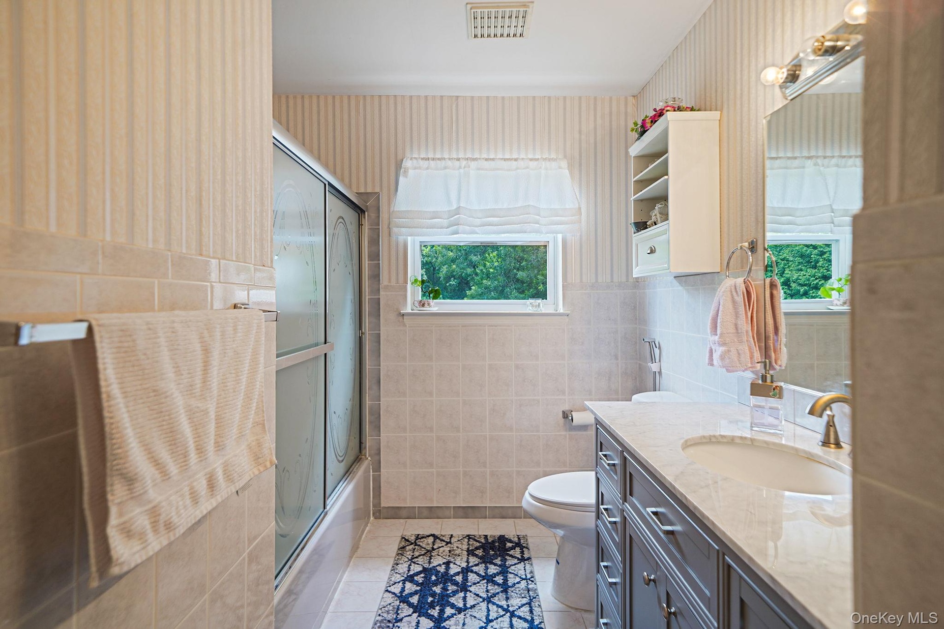 - Full bathroom with vanity, tile walls, tile patterned floors, and shower / bath combination with glass door
