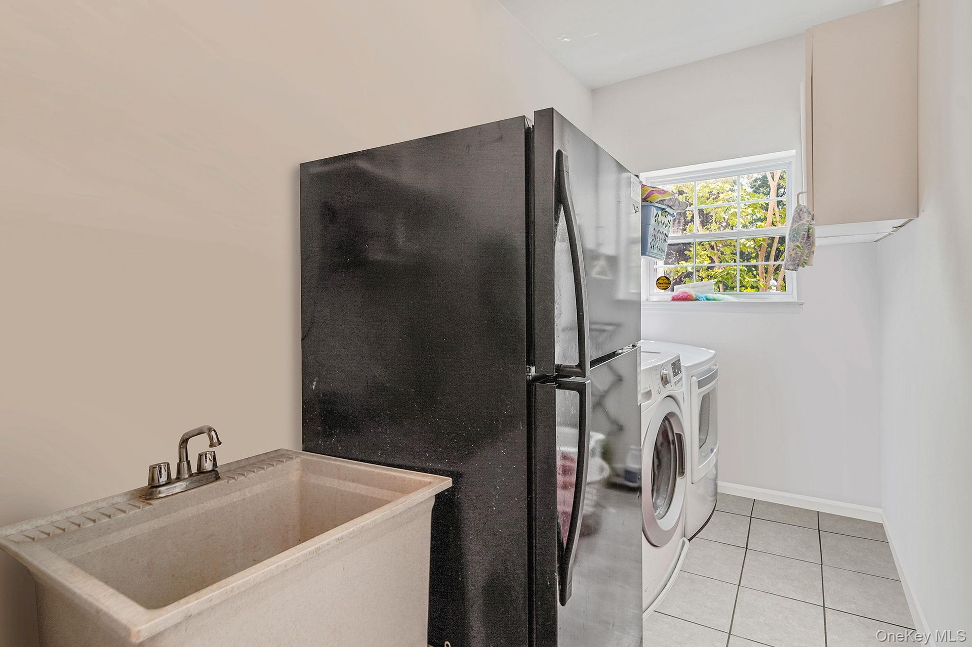 - Laundry room with light tile patterned floors and washer and clothes dryer