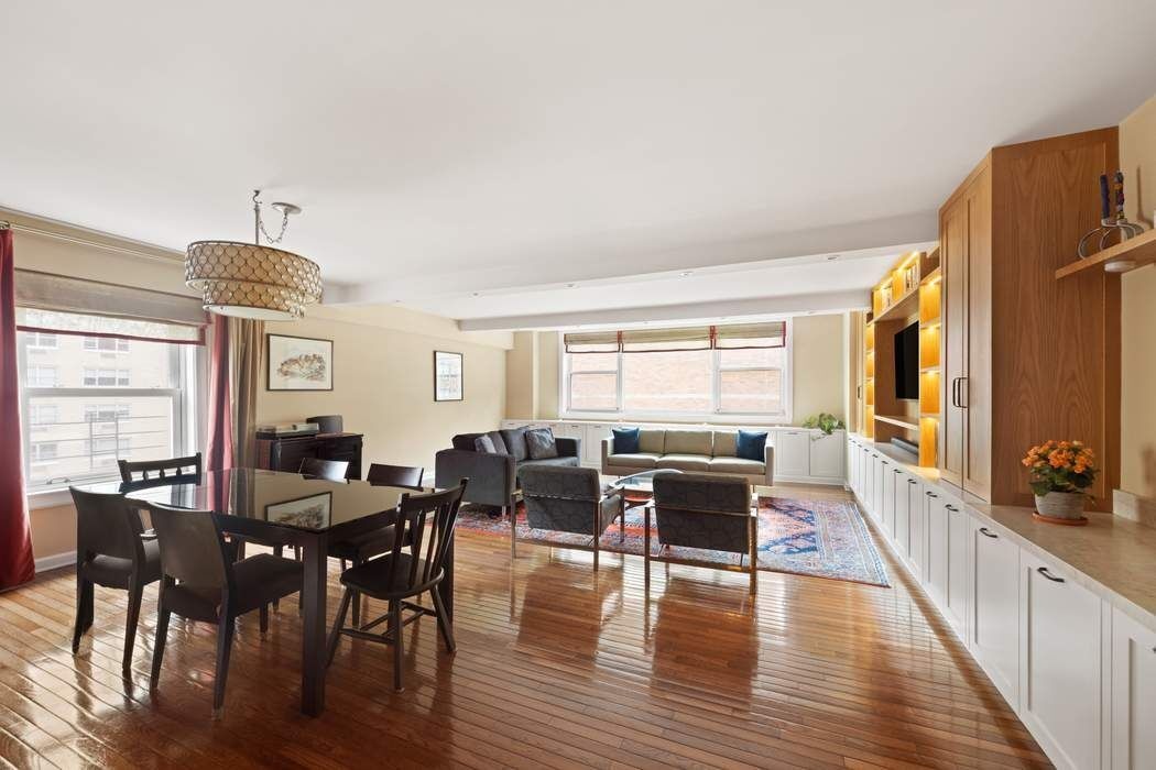 A wide entry gallery welcomes you—an ideal space for art display or added storage—setting a tone of quiet sophistication from the moment you arrive. Flowing seamlessly from the gallery is an expansive, open-concept living and dining area, enhanced by a custom built-in media wall and integrated cabinetry. Measuring approximately 20'2" x 24'6", the scale and ceiling height evoke a loft-like ambiance rarely found in postwar construction. The adjacent dining alcove, currently open to the living area, can easily be enclosed to create a third bedroom, home office, or den—offering extraordinary flexibility without compromising the airy layout.