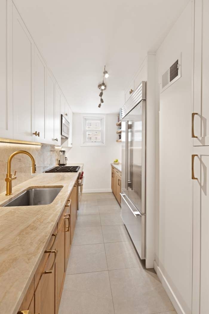 The recently renovated windowed Chef’s kitchen is a study in clean architectural lines, featuring stone countertops, premium stainless-steel appliances, and chic hardware. Sunlight pours in through a window at the far end, adding warmth and depth to the space.