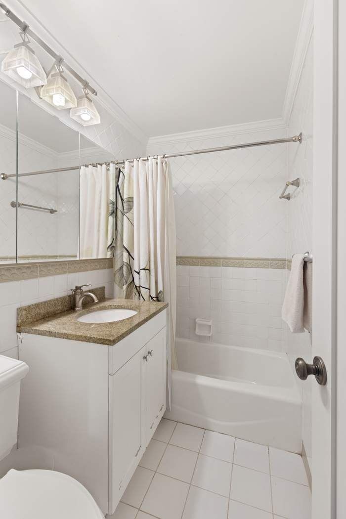 Both bedrooms are generously scaled and thoughtfully positioned for privacy. The corner primary suite enjoys dual exposures, two oversized closets, and a windowed en-suite bathroom appointed with classic tilework, a full vanity, and a deep soaking tub—a peaceful, spa-like sanctuary. The second bedroom is equally impressive, comfortably accommodating two full beds with room to spare, and includes excellent storage. A second full bathroom, located off the hallway, features timeless finishes and exceptional utility for residents and guests alike.