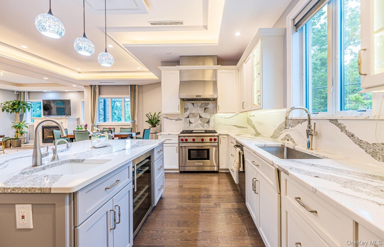 - Kitchen featuring luxury stove, a raised ceiling, backsplash, exhaust hood, and hanging light fixtures