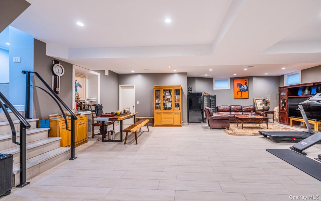 - Living room with recessed lighting and stairway