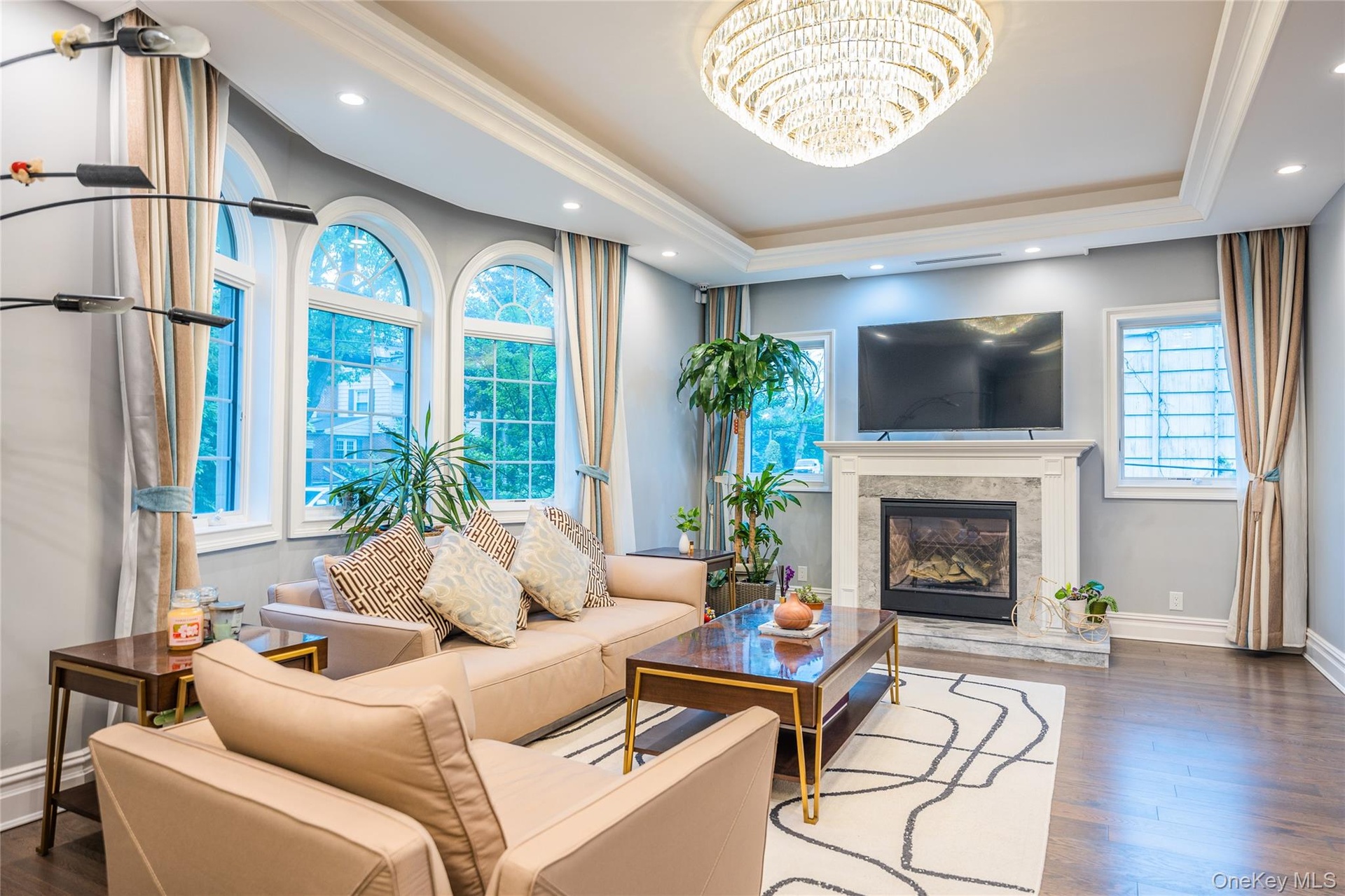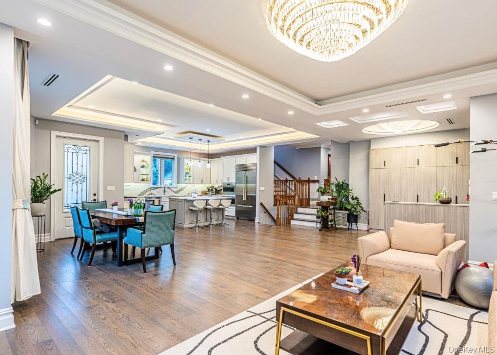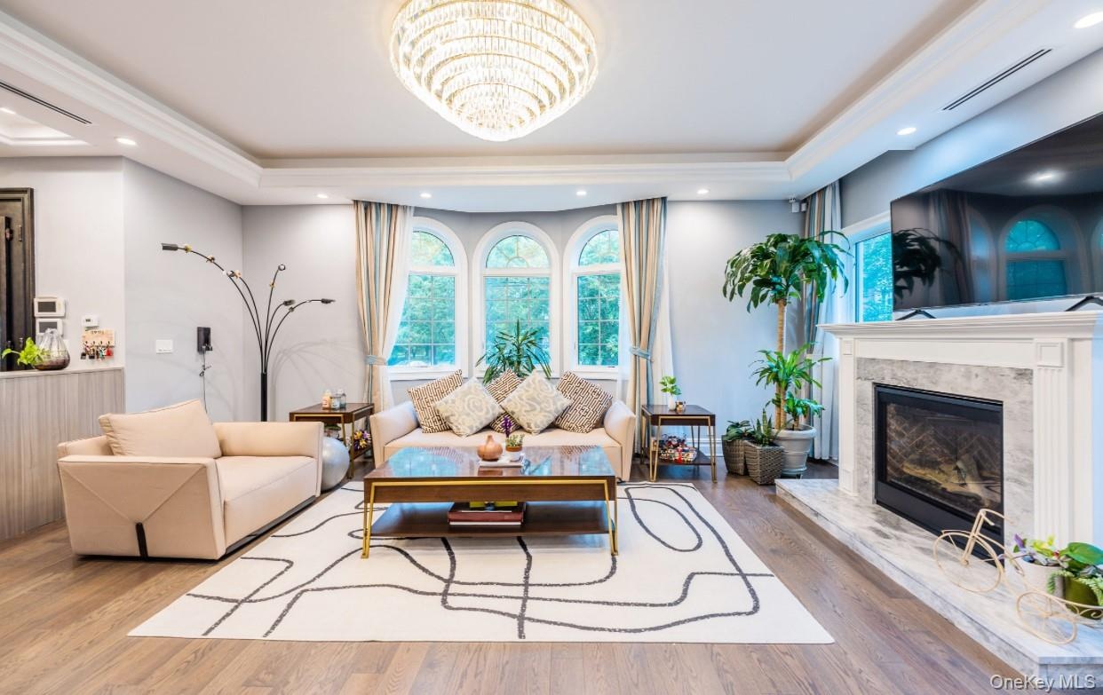 - Living area featuring a tray ceiling, wood finished floors, a chandelier, a premium fireplace, and recessed lighting