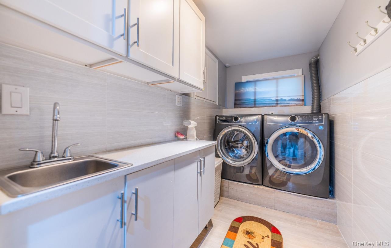 - Laundry area featuring cabinet space, washer and clothes dryer, and tile walls