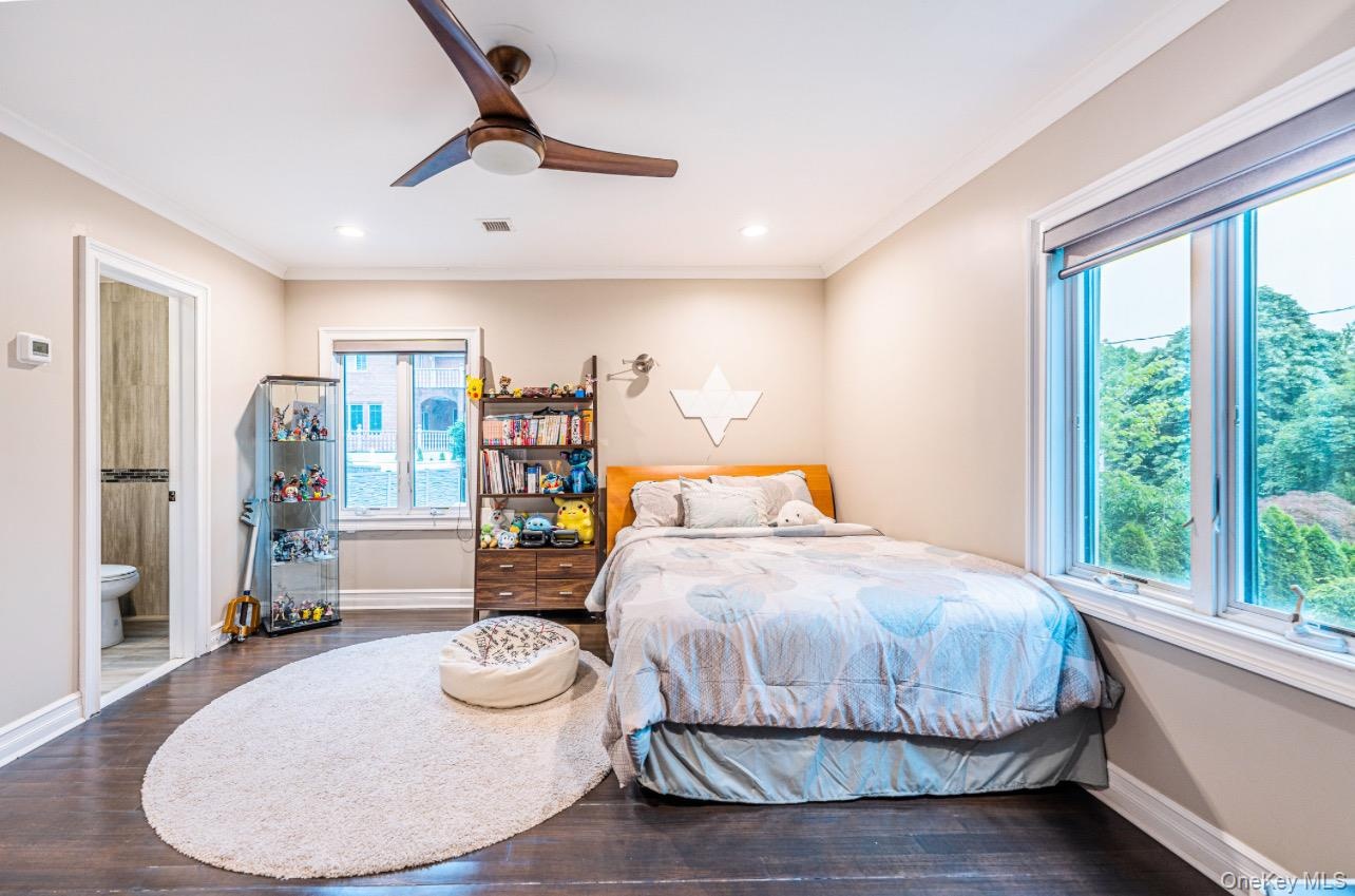 - Bedroom featuring multiple windows, wood finished floors, ornamental molding, recessed lighting, and connected bathroom