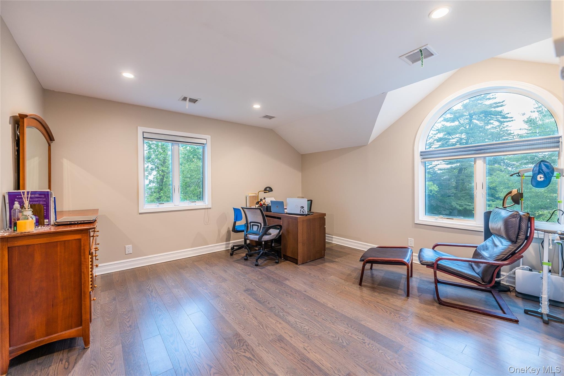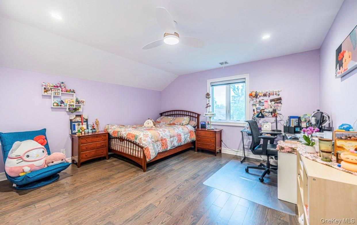 - Bedroom with wood finished floors, ceiling fan, a desk, recessed lighting, and vaulted ceiling