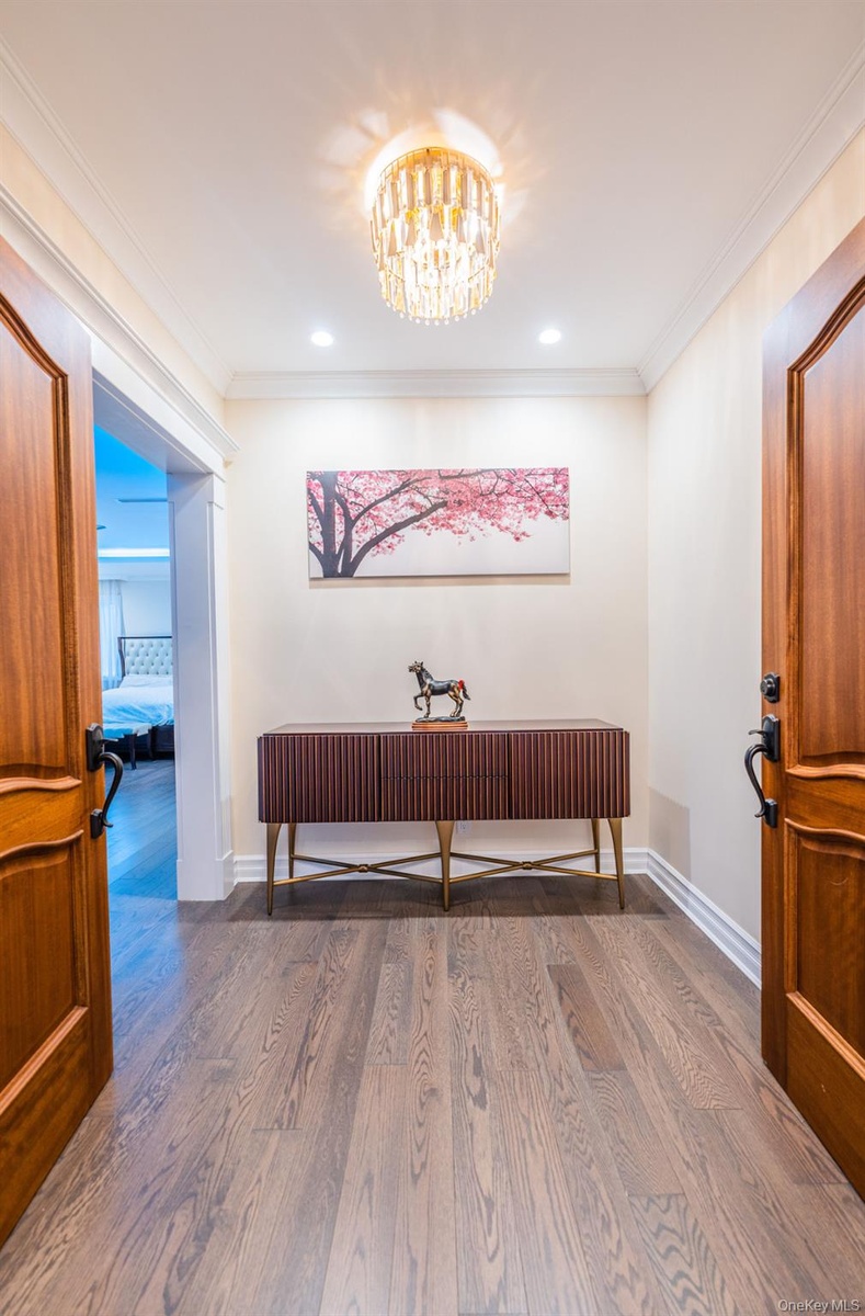- Hallway with crown molding, a chandelier, wood finished floors, and recessed lighting