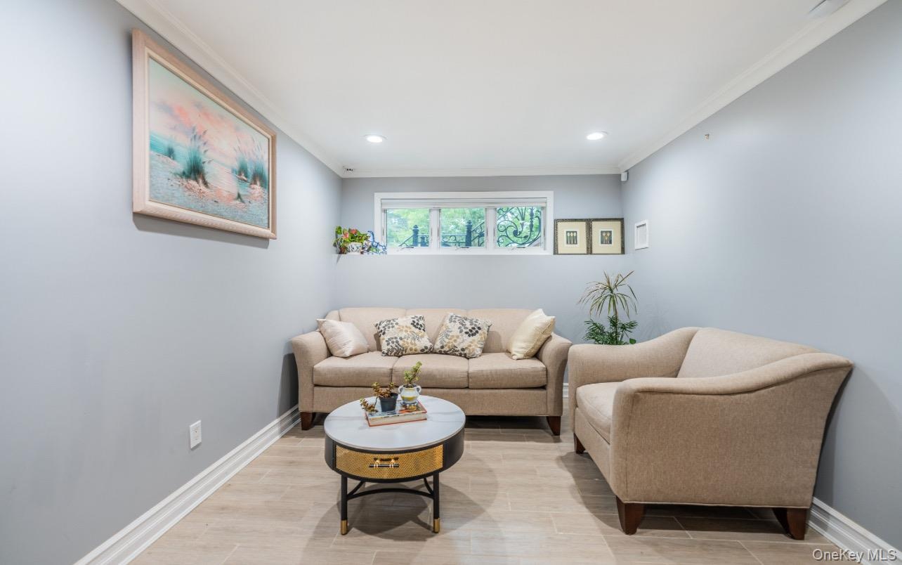 - Guests room with crown molding, recessed lighting, and light wood-style floors