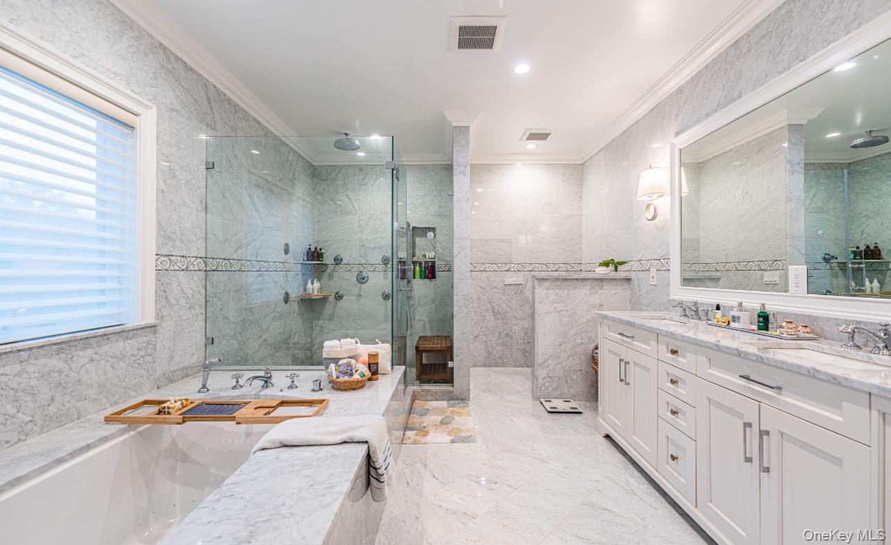 - Bathroom featuring crown molding, a marble finish shower, healthy amount of natural light, a bath, and double vanity