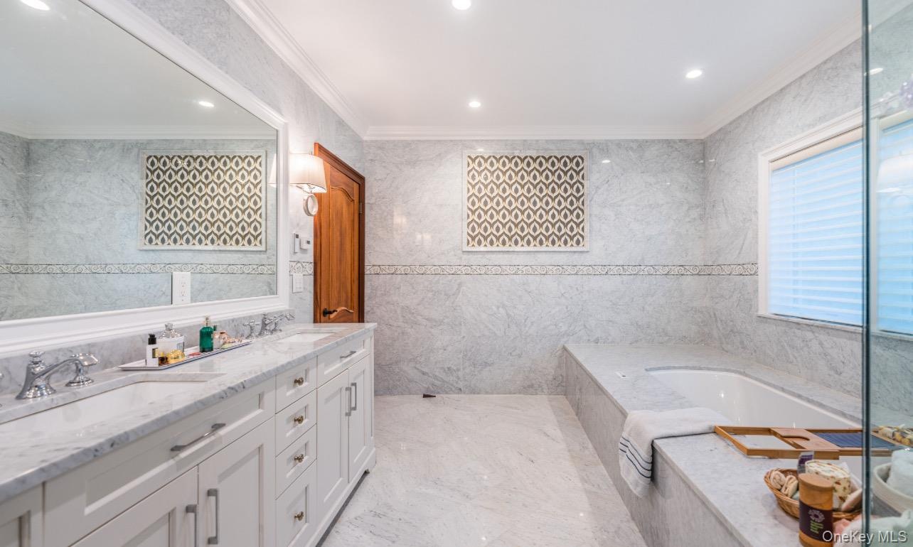 - Bathroom with ornamental molding, double vanity, a bath, recessed lighting, and tile walls