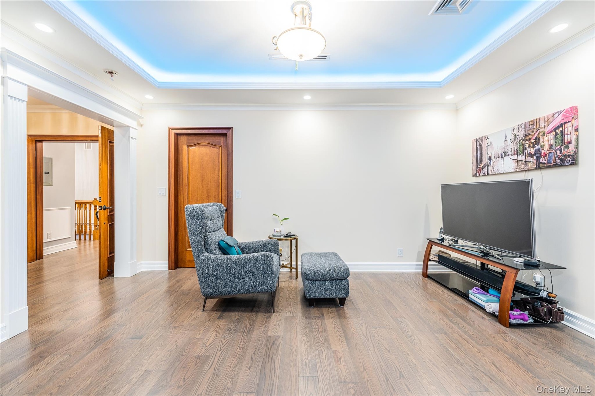 - Sitting room with a raised ceiling, crown molding, and wood finished floors