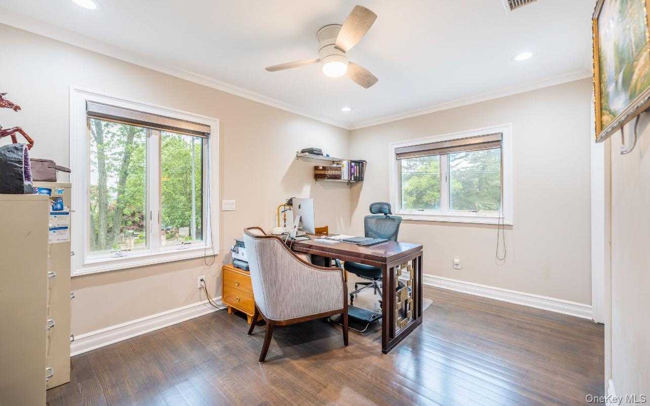 - Office featuring a ceiling fan, hardwood / wood-style floors, ornamental molding, and recessed lighting