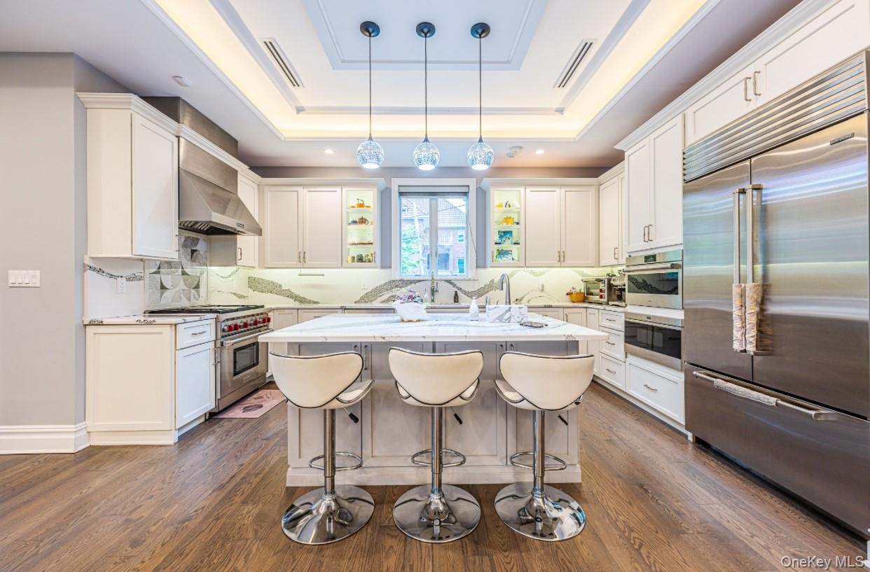 - Kitchen with high end appliances, a tray ceiling, wall chimney exhaust hood, and dark wood-style floors