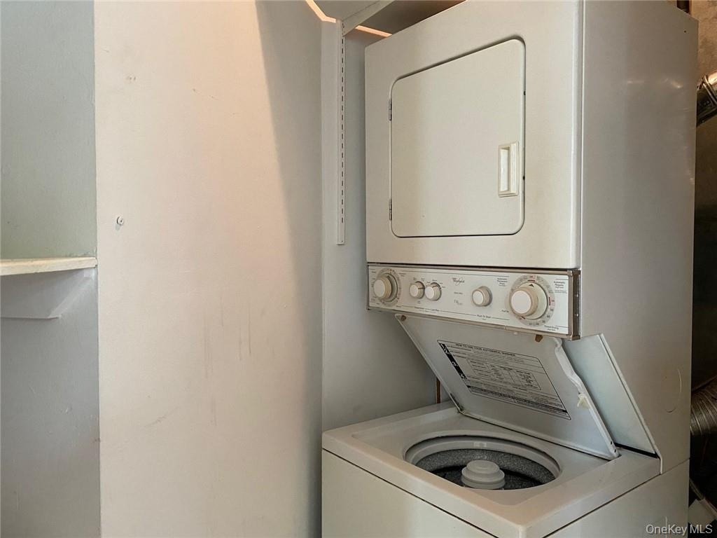 - The utility closet opposite the kitchen includes the washer/dryer and storage shelving, plus the utilities for the unit.
