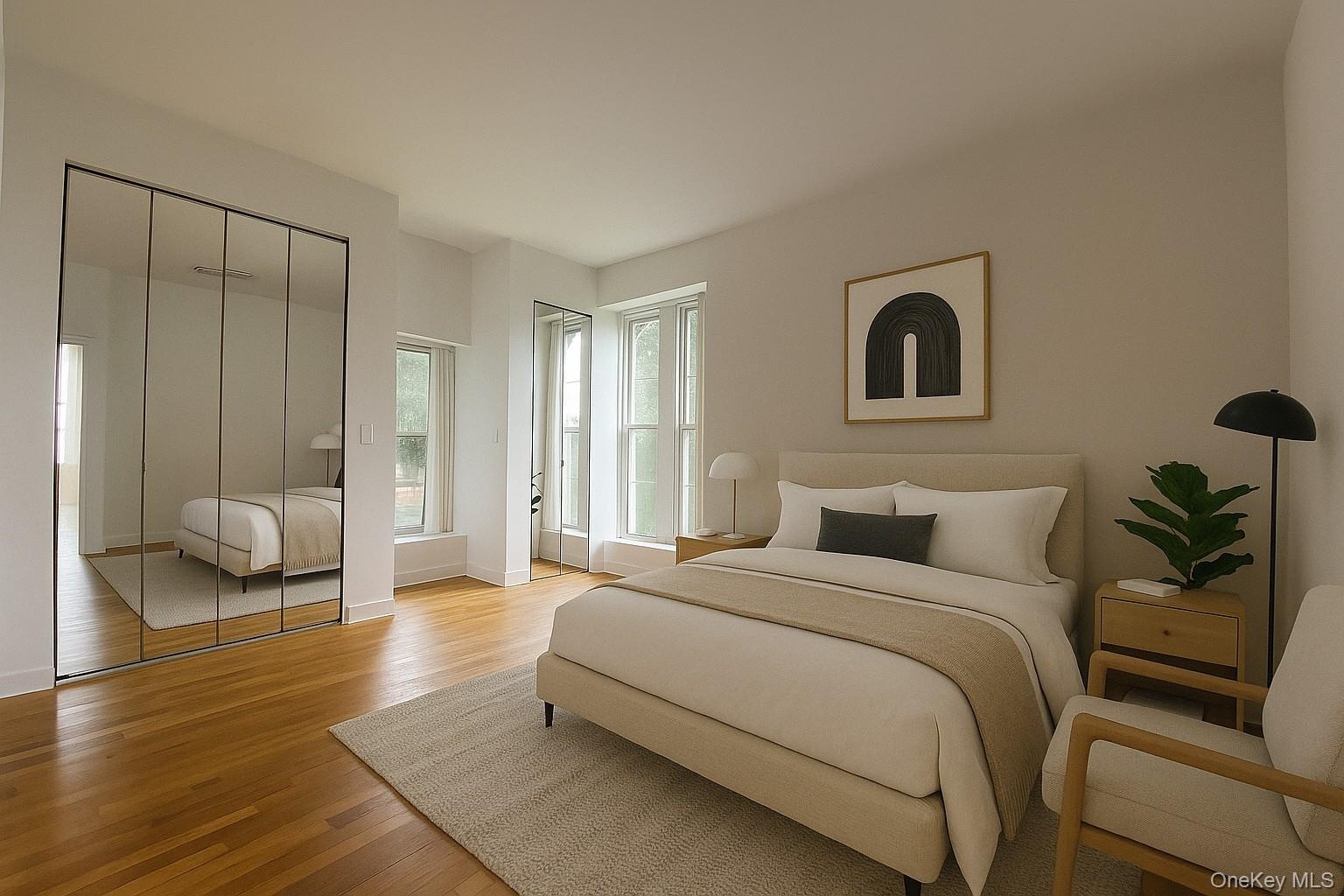 - Closeup of wall of mirrored closets and two windows facing gardens.