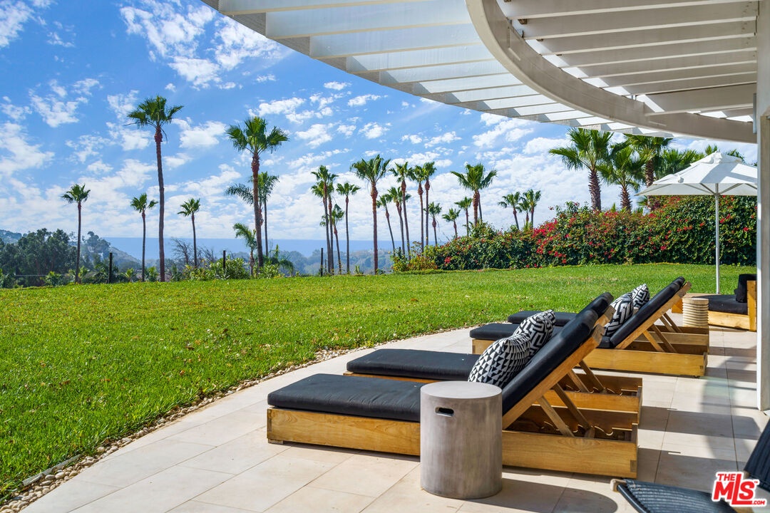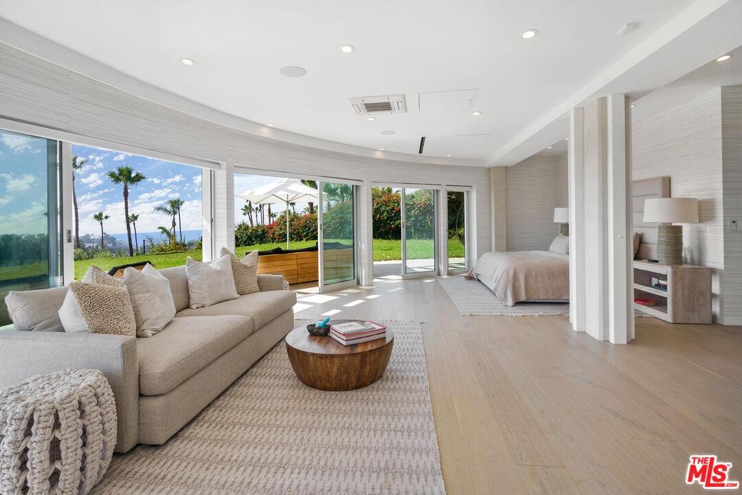 A stunning architectural masterpiece where privacy and creativity converge in the exclusive gated enclave of Cavalleri. Fully renovated with impeccable designer finishes, this home features floor-to-ceiling glass walls, White Oak floors, and a central spiral staircase. Enjoy panoramic ocean and mountain views from multiple decks, including a newly redone rooftop deck offering 360-degree vistas, an indoor wet bar, a built-in BBQ, and a fire pit. The entry level is an entertainer's dream with an open-concept layout, featuring multiple seating areas, serene coastal views, and stacking glass doors that lead onto a wrap-around deck. The dining area flows seamlessly into the chef's kitchen, boasting Miele appliances, Labradorite stone countertops, a gas range with dual ovens, and a large island with breakfast bar seating. The luxurious primary suite overlooks the sparkling Pacific and includes a comfortable sitting area, motorized drop-down television, spa-like bath with dual rain steam shower, free-standing porcelain soaking tub, and direct access to a sun-soaked patio. Two additional en-suite bedrooms and a detached guest suite provide ample space for family and guests. Outside, a grassy lawn wraps around the home, and there are plans available for a future pool. Additional features include a full-home Sonos system, remote-controlled blackout shades, a laundry room, and a 2-car garage. All set within a private, gated community on a quiet cul-de-sac with convenient trail access and a central location near local markets, schools, restaurants, pristine beaches, and more. Experience Malibu at its finest, where breathtaking beauty and refined coastal elegance come together in one remarkable home.