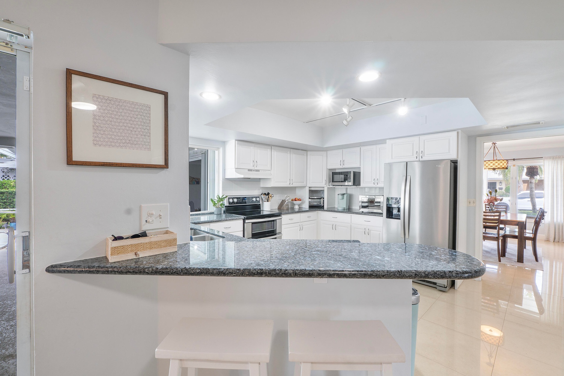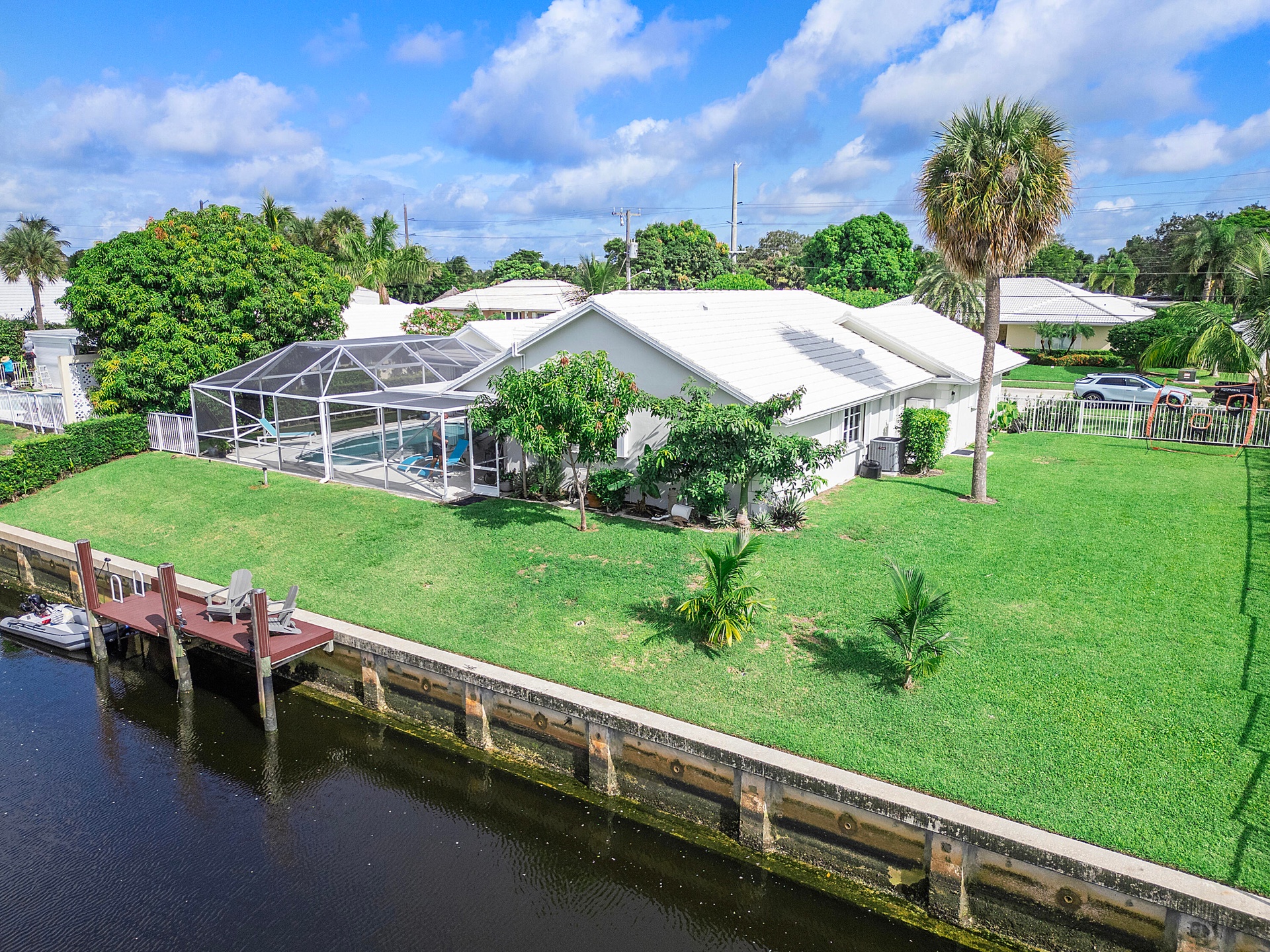 Peaceful atmosphere. Long water views in prestigious Camino Gardens. Private Dock on 100 foot waterfront seawall. Solar heated Pool Located on a quiet cul de sac street in East Boca close to the beaches, restaurants, shopping, nightlife, fitness centers, beach yoga, Trader Joes, Town Center Mall, Mizner Park FAU, A+ schools, Pets welcome! The interior features include spacious living and dining rooms, an open kitchen with stainless steel appliances, double ovens, granite countertops, Master Suite, separate tub and shower, Walk-in closets in every bedroom. Cabana bath. Laundry room with sink & a bonus wall to wall cedar lined closet perfect for winter and clothes not worn frequently, crema marfil porcelain tile floors, and modern ceiling fans.