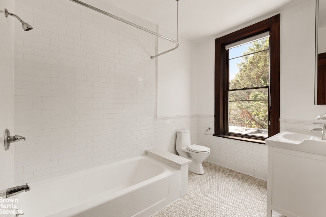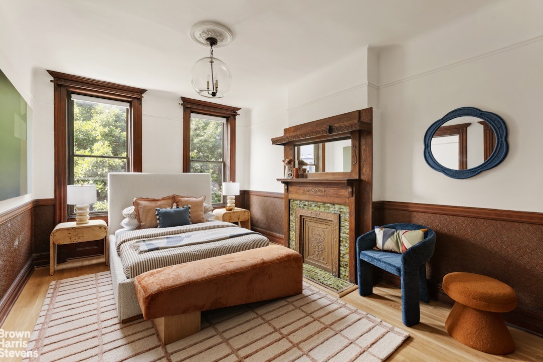 Upstairs, four bright and spacious bedrooms await, each with generous closets, hardwood flooring, and sun-drenched exposures. The primary suite is a true retreat, featuring a dramatic bay window, original fireplace mantel, and a custom walk-in closet with over 100 square feet of storage. Four elegantly renovated bathrooms are positioned throughout the home, along with an additional powder room on the lower level. A washer and dryer and security system provide added convenience and peace of mind.