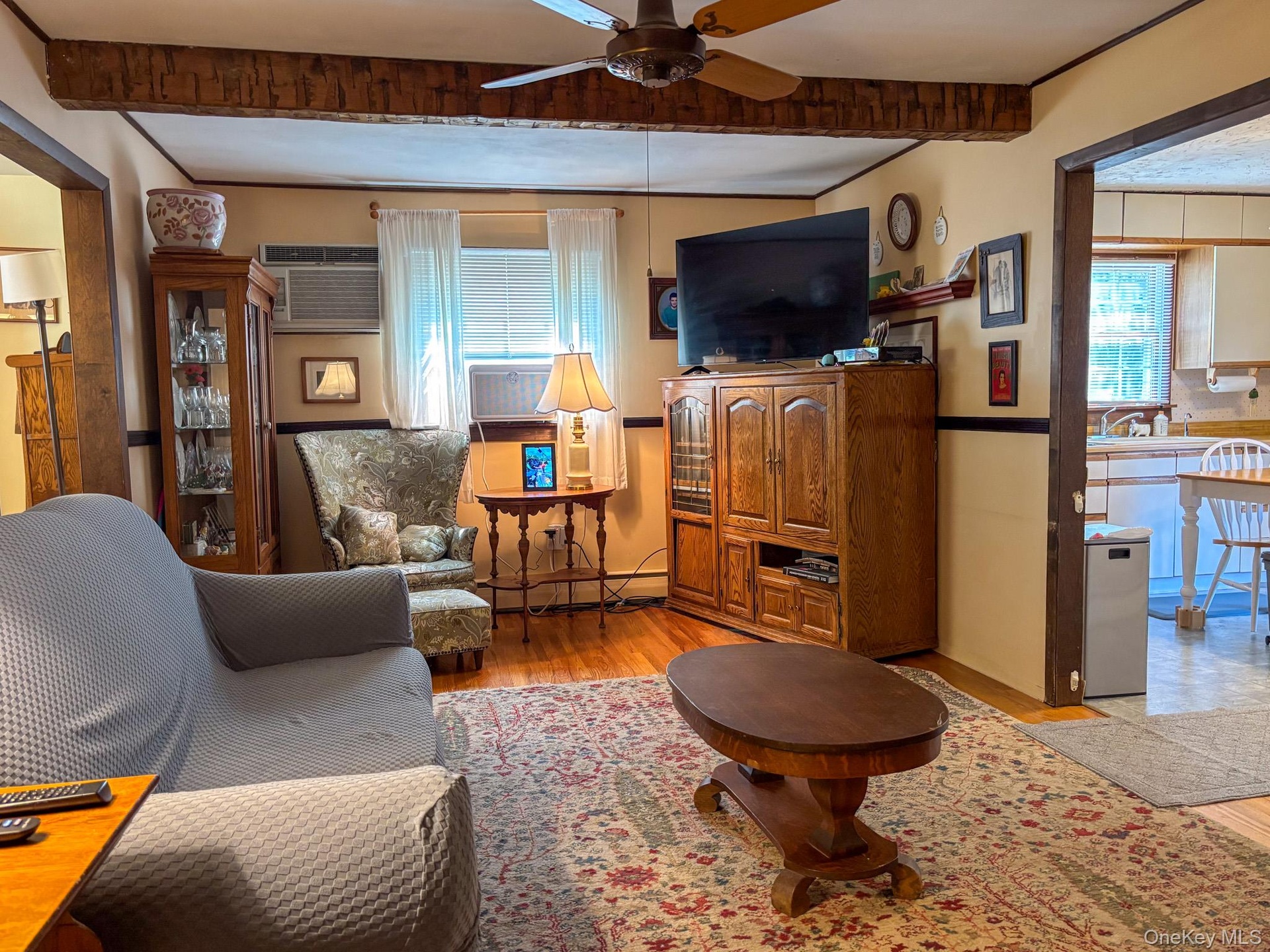 - Living room with wood finished floors, beamed ceiling, and a ceiling fan