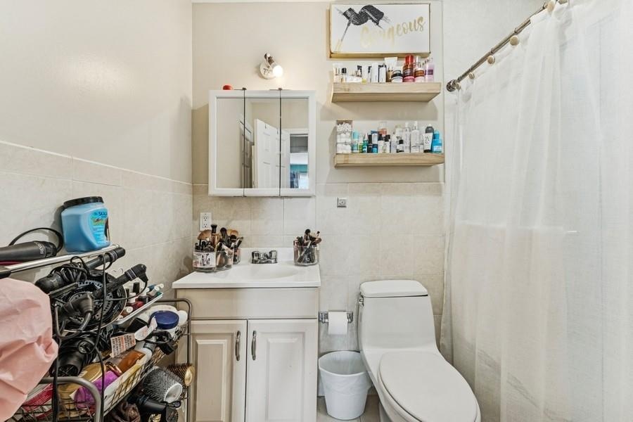 - Bathroom featuring tile walls, vanity, a wainscoted wall, and a shower with curtain