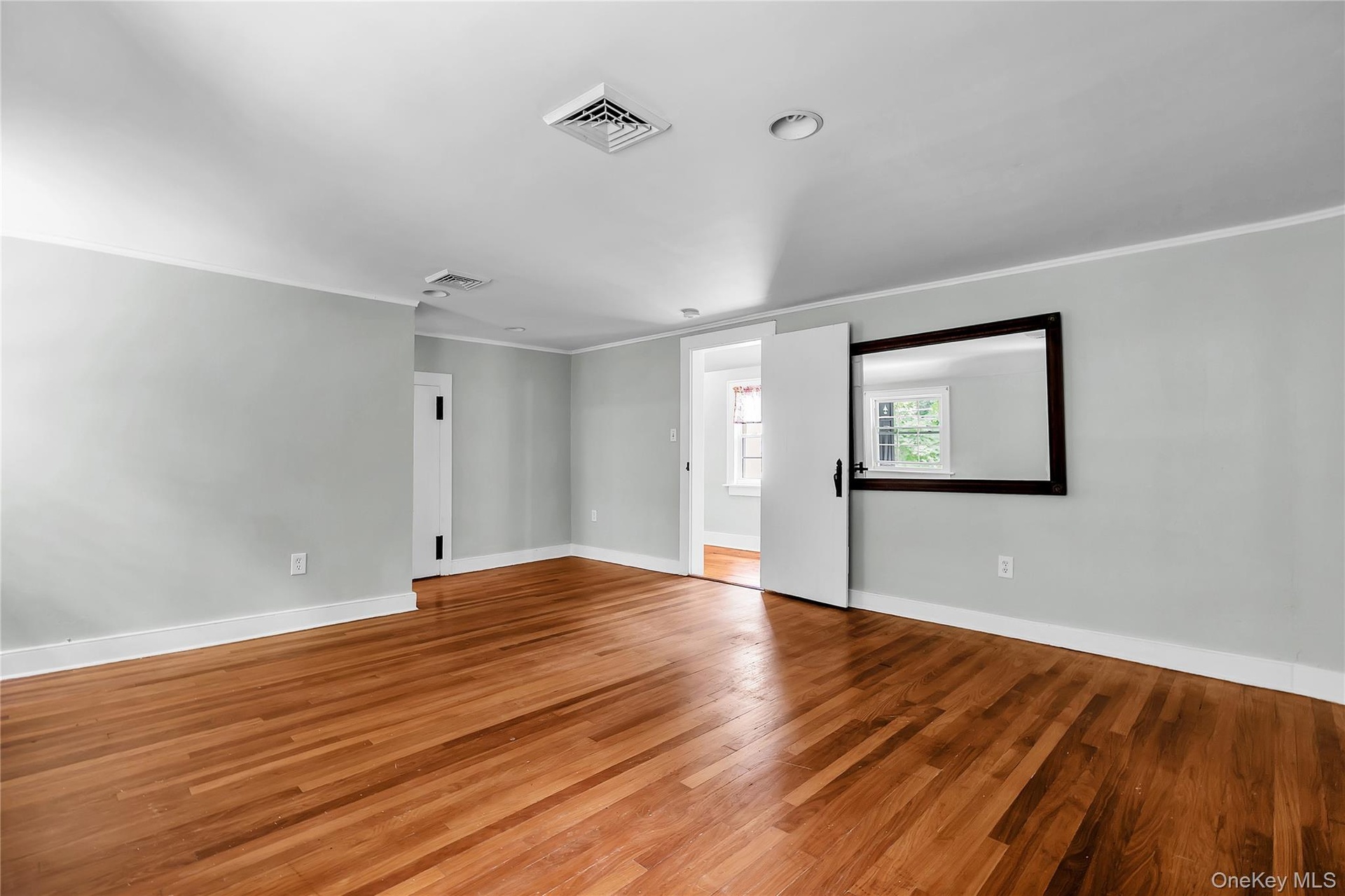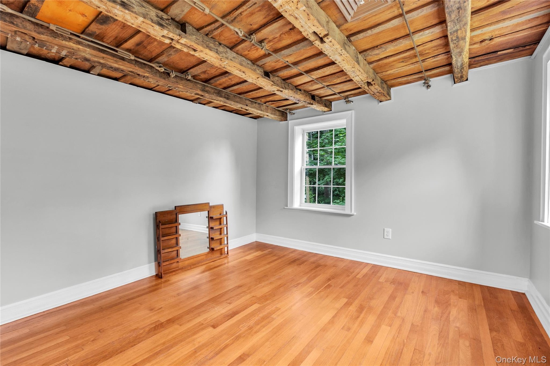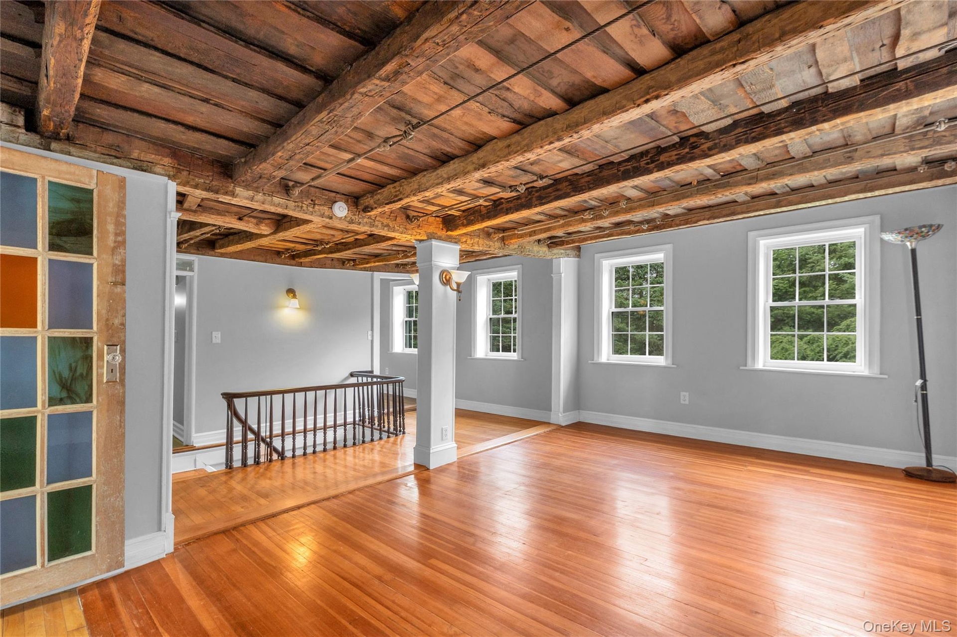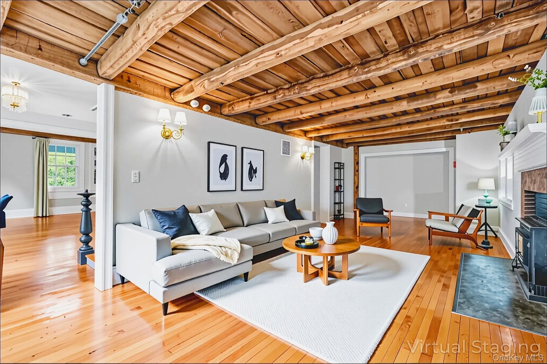 - Living area with a wood ceiling with exposed beams and wood-type flooring