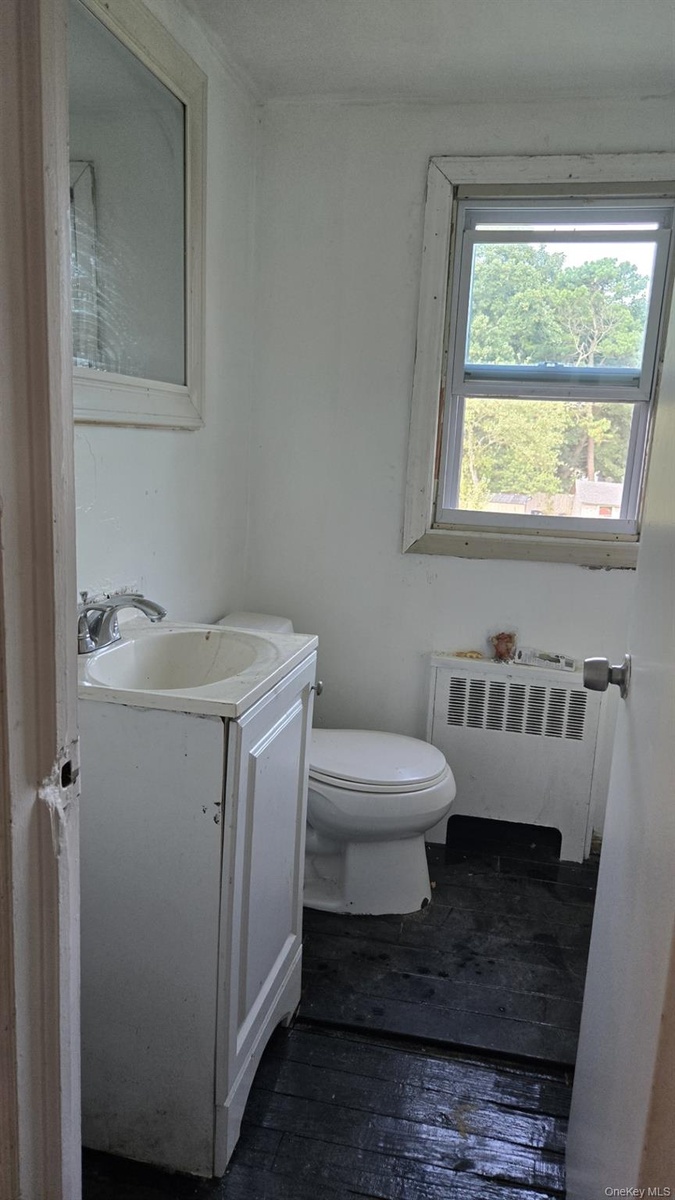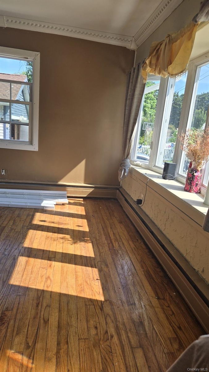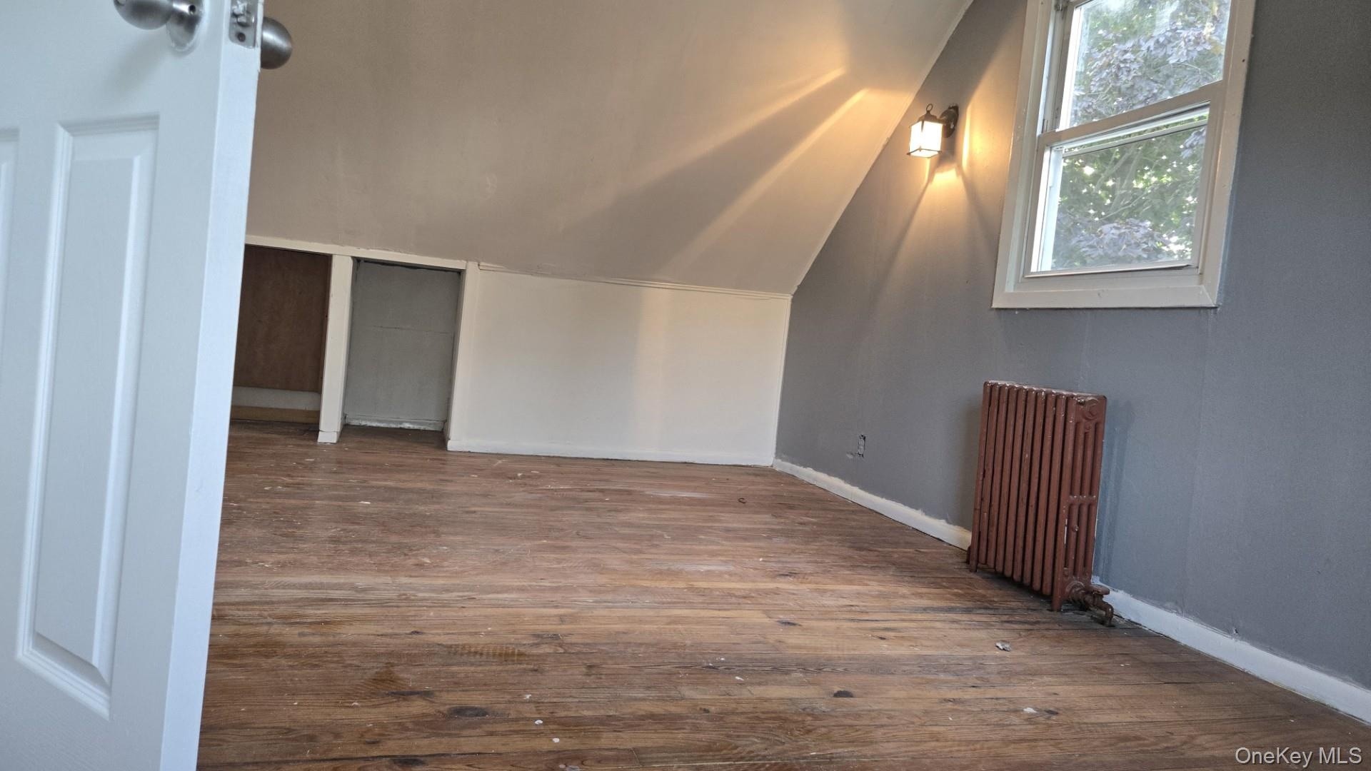 - Additional living space featuring hardwood / wood-style flooring, radiator heating unit, and vaulted ceiling