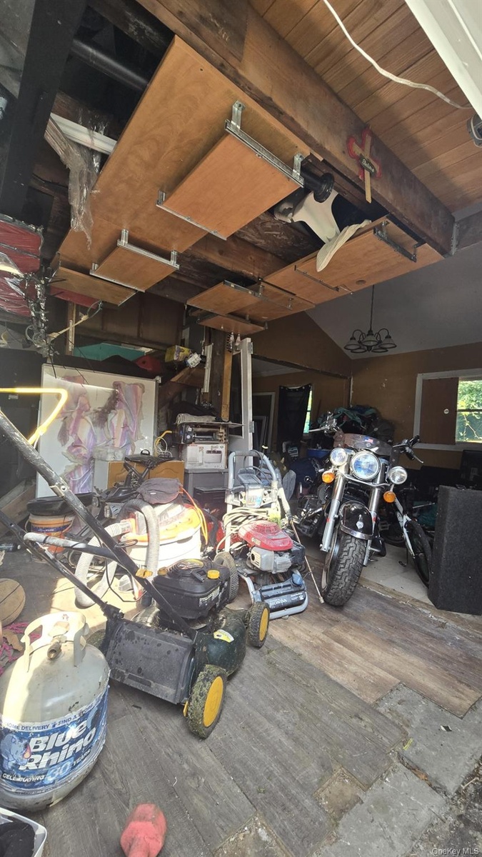 - View of front of house featuring a garage, a fenced front yard, and an outbuilding