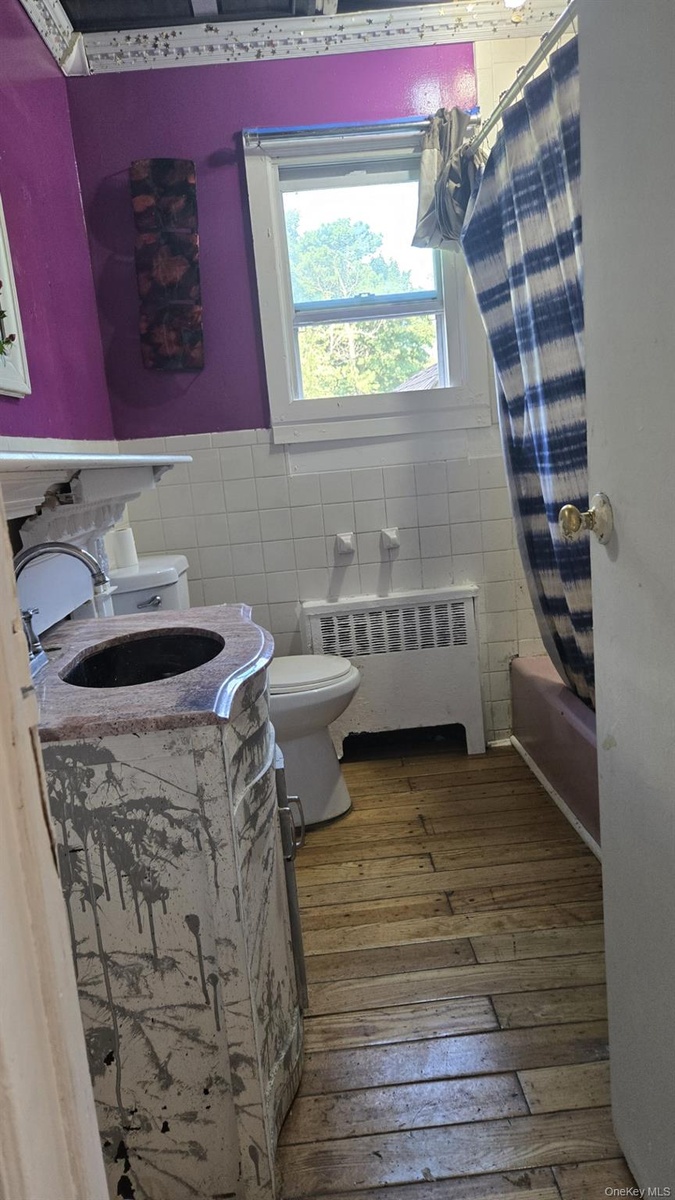 - Bathroom with radiator, hardwood / wood-style floors, vanity, shower / bath combination with curtain, and tile walls