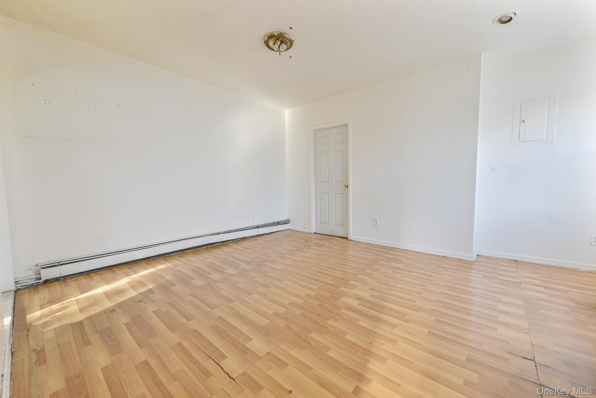 - Empty room featuring light wood-type flooring and a baseboard radiator